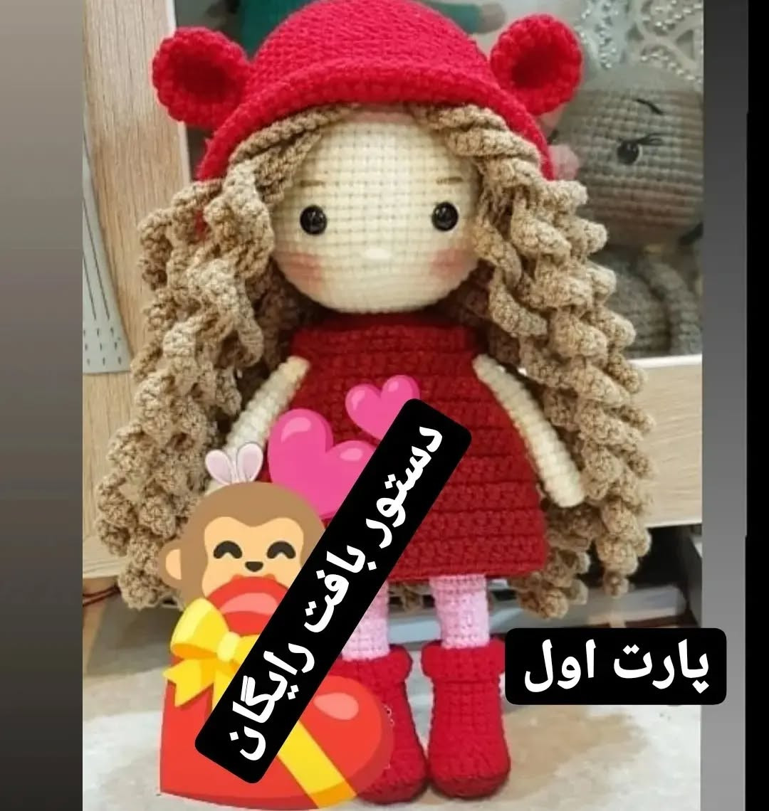 عروسک بافتنی با کلاه قرمز و موهای فر