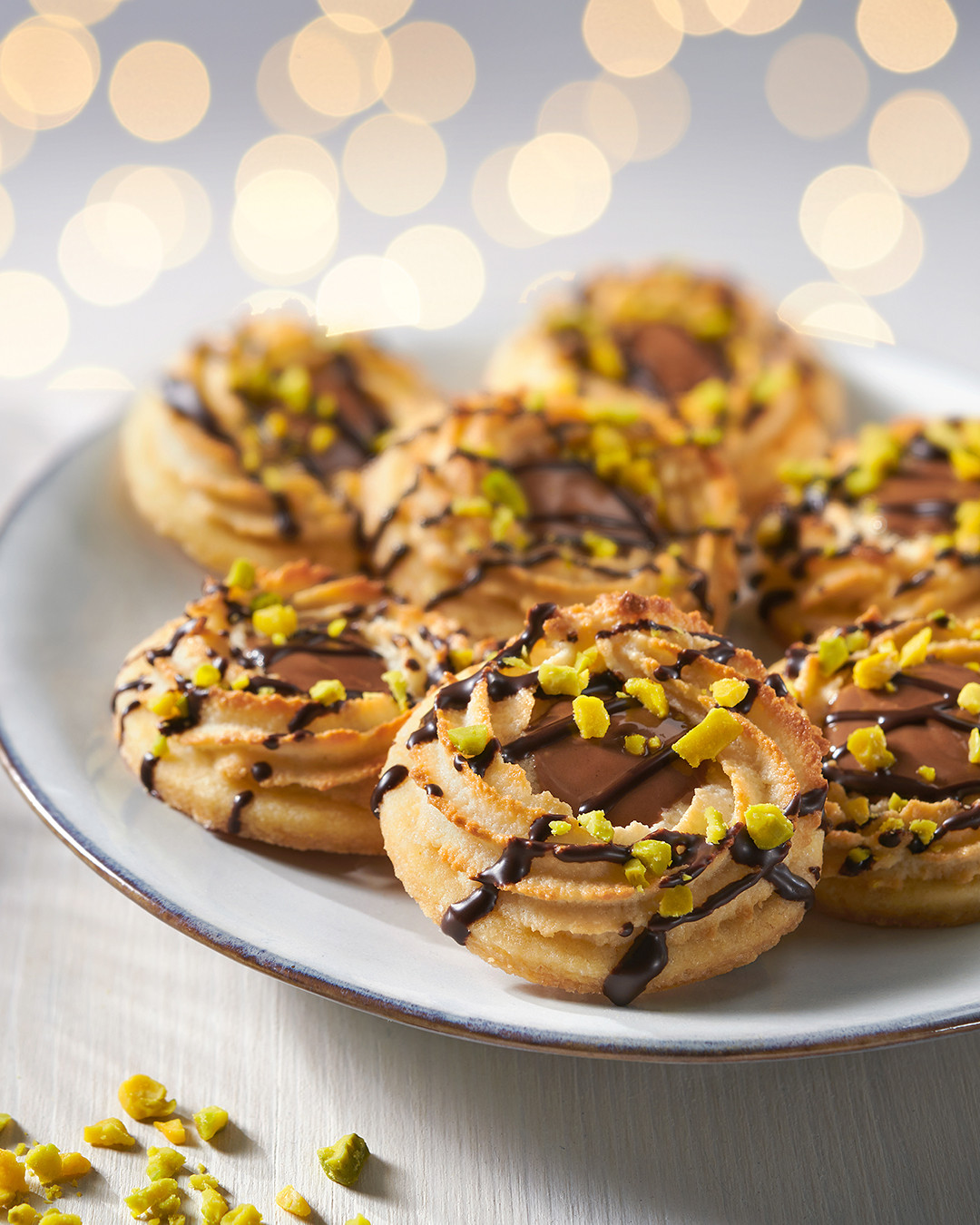 Dolgu ve süsleme: Sütlü çikolatayı benmari yöntemi ile eritin. Soğuyan kurabiyelerin orta kısımlarına doldurun. Bitter çikolatayı da benmari yöntemi ile eritin ve pişirme kağıdından hazırladığınız huniye doldurun. Kurabiyelerin üzerlerine şerit olarak sıkın ve bekletmeden Antep fıstıklarını serpin. Çikolatalar donuncaya kadar bekletip servis yapın.