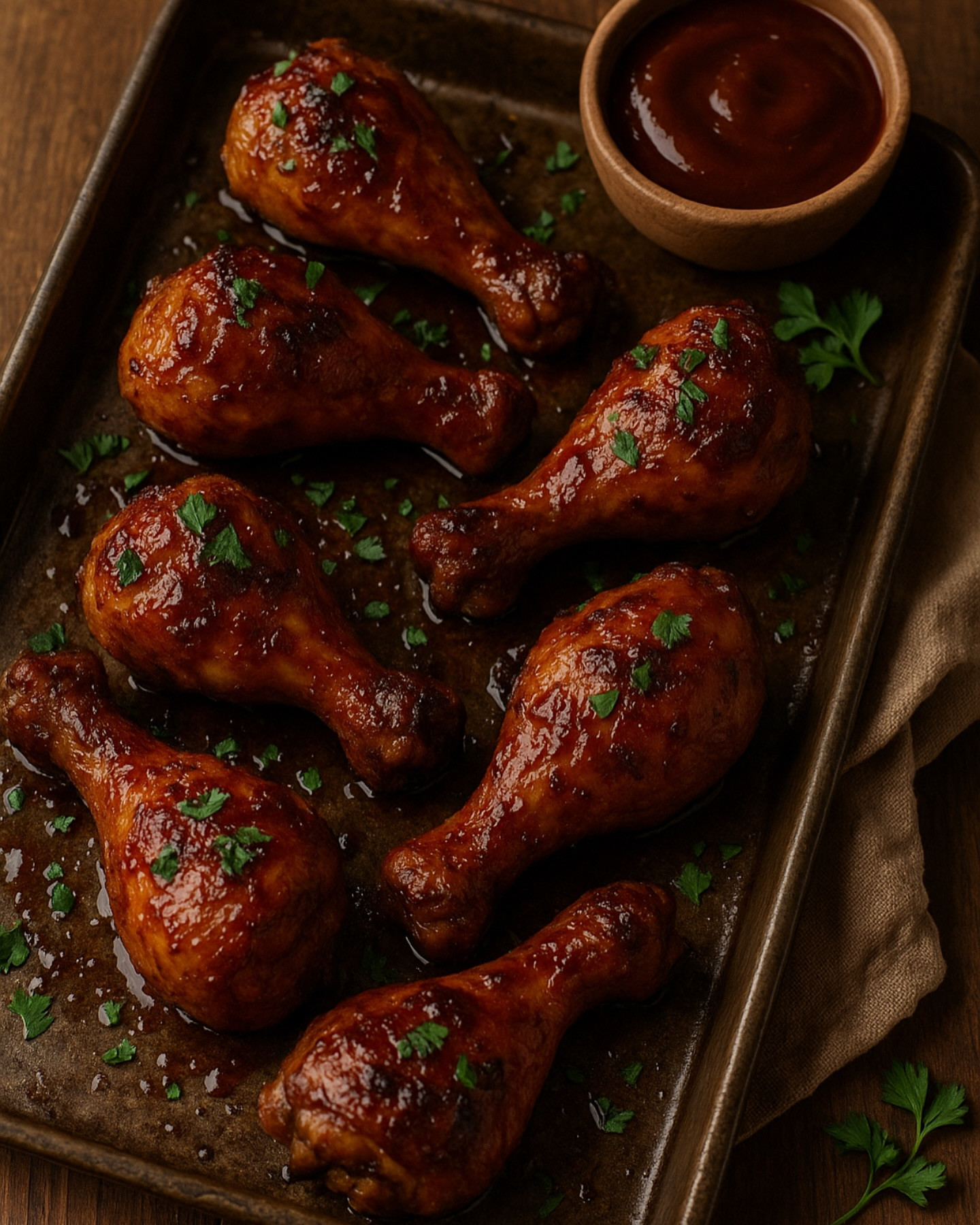 Instructions: 1. Preheat oven: Heat oven to 400°F (200°C). Line a baking tray with foil and lightly grease. 2. Season the drumsticks: Rub chicken with oil, paprika, garlic powder, salt, and pepper. Bake for 35–40 minutes, flipping halfway through, until golden and cooked through. 3. Make the glaze: While the chicken bakes, combine BBQ sauce, apple cider, honey, vinegar, mustard, and chili flakes in a saucepan. Simmer for 5–7 minutes until slightly thickened. 4. Glaze & finish: Brush baked chicken with the glaze. Return to oven under the broiler for 3–4 minutes until caramelized and sticky. 5. Serve: Garnish with parsley and serve with extra glaze.