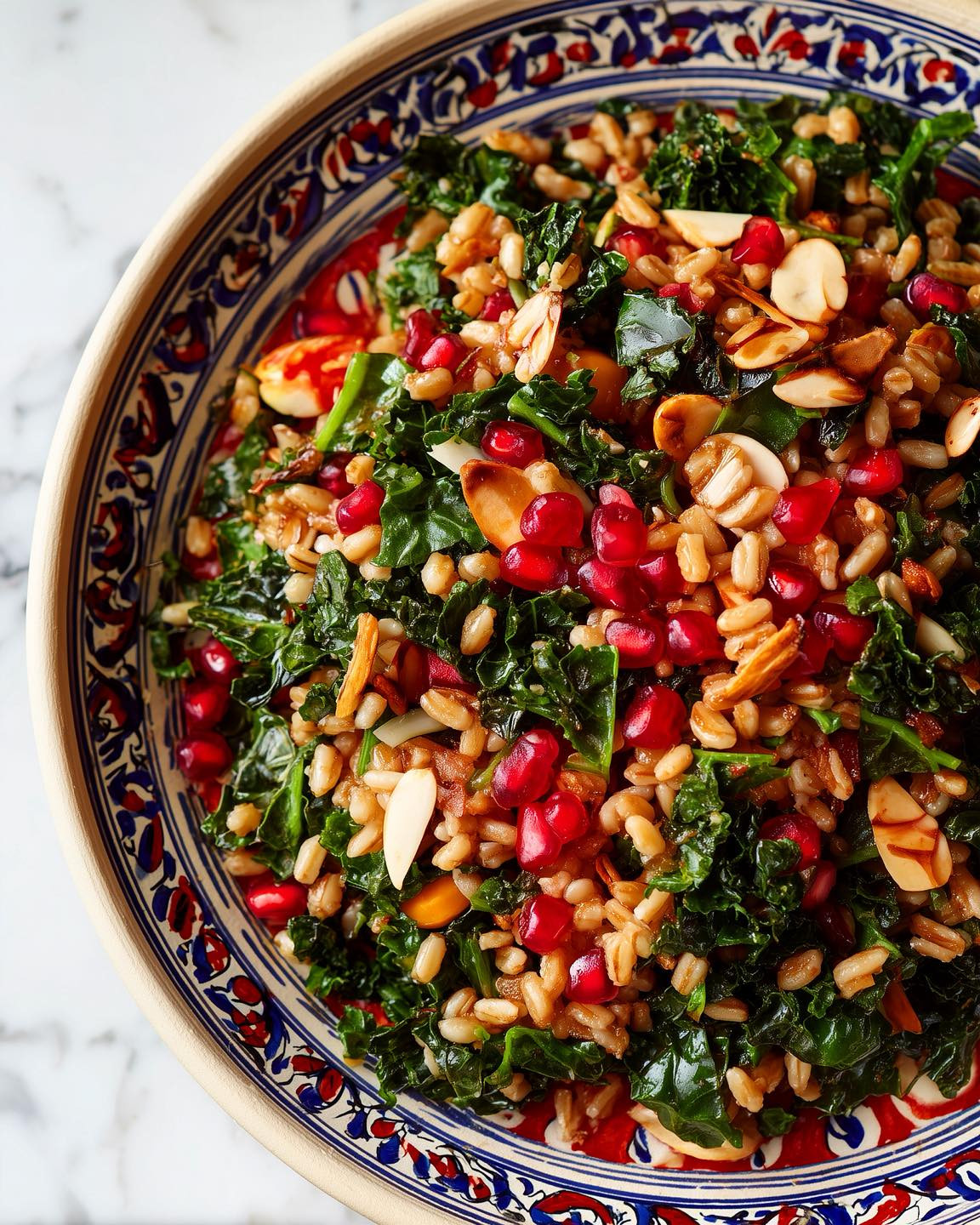 Method 1. Cook the farro until tender, drain, and set aside. 2. Sauté shallot and garlic in olive oil until fragrant. Add kale and cook until just wilted. 3. Combine farro, kale, roasted pepper, pomegranate, and almonds in a large bowl. 4. Whisk the dressing ingredients and pour over the salad. Toss until evenly coated. 5. Taste and adjust seasoning, then serve warm.
