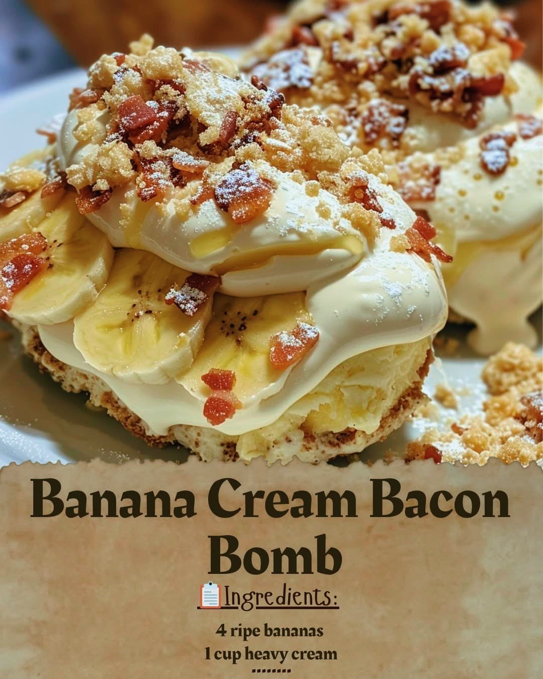 Serve warm and enjoy the delicious combination of sweet banana cream and salty bacon!