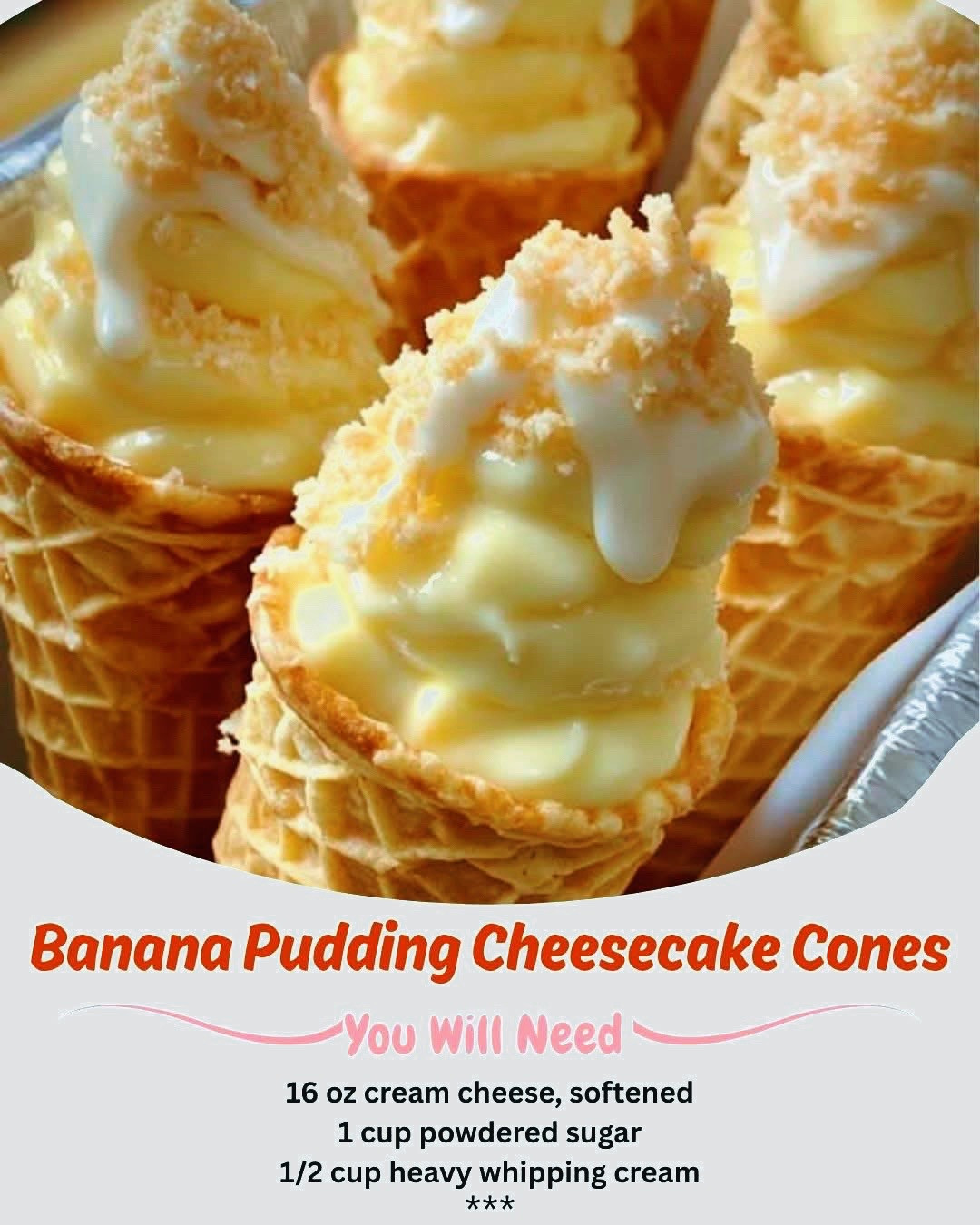 Spoon or pipe the banana pudding cheesecake filling into the prepared cones, filling them generously.