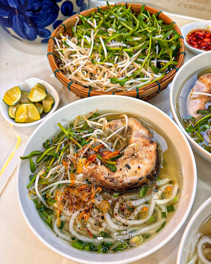 Thành phẩm tô bánh canh cá lóc nóng hổi, nước dùng ngọt thanh, cá lóc săn chắc thơm ngon, rau đắng và giá giòn mát, hành mùi dậy hương. Ăn kèm nước mắm mặn cay thì đúng chuẩn món ngon miền quê.