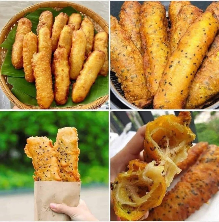 Bước 2: + Lột vỏ chuối, chẻ làm 2 theo chiều cao, cho lần lượt từng miếng vào 1 túi nilon rồi dùng thớt ép xuống. Ép vừa phải thôi nhé cẢ nhà, lần đầu em ép hơi quá tay nên làm hơi khó. + Cho từng miếng chuối đã ép vào tô bột, trở đều chuối sao cho hỗn hợp bột phủ đều các mặt chuối, rồi thả chuối vào chiên ngập dầu nha. (Lưu ý là chiên sơ thôi) + Khi thấy lớp bột đã chuyển sang màu vàng thì mình lấy ra rồi lăn qua thêm một lớp bột nữa, mang đi chiên tiếp đến khi thấy chuối vàng giòn thì mang ra giấy thấm để bớt dầu. Ẩn bớt