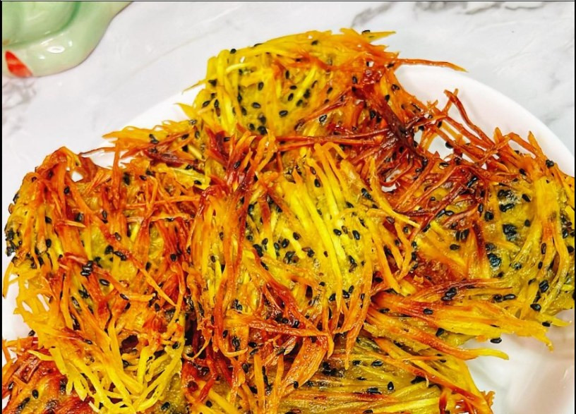 CÁCH LÀM BÁNH KHOAI LANG CHIÊN GIÒN ƠI LÀ GIÒN😋 + Nguyên liệu: 1 củ khoai khoảng 200g bột mì 40g bột chiên giòn 30g đường 10g bột nghệ 1 xíu mè đen 5g vani 2 giọt nước hoặc sữa tươi 140ml. + Cách làm: • Trừ khoai ra ta trộn hết các nguyên liệu còn lại vào cùng một bát tô, khuấy đều và để bột nghỉ 15-20 phút. • Khoai gọt vỏ, rửa sạch, nạo sợi. Sau đó cho khoai vào trộn cùng bột cho đều, để bột thấm đều vào khoai. • Cho dầu vào chảo, khi dầu nóng thì múc từng muôi khoai vào chiên, lửa nhỏ vừa. Khi bánh vàng đều hai mặt là được. Để ráo dầu và ăn thôi👌 Chúc các bạn thành công!