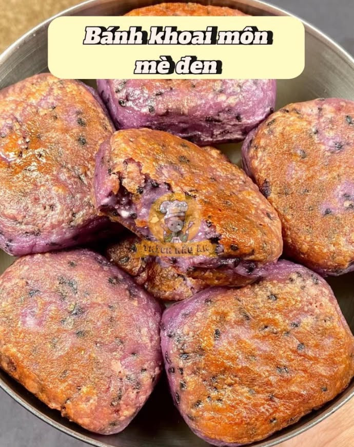 Bánh Khoai Môn Mè Đen Chuẩn bị nguyên liệu : - 200g khoai môn - Bột nếp - Mè đen - Sữa tươi ( không đường ) - Đường - Bột khoai tím Cách Làm : 1 . Khoai môn hấp chín , nghiền nhuyễn . Thêm 1 thìa đường , 3 thìa sữa tươi và 1 thìa cafe bột khoai tím , trộn đều . 2 . Cho tiếp 2 thìa bột nếp và 1 thìa mè đen , tiếp tục trộn đều . 3 . Chia bánh thành từng phần nhỏ , nặn thành khối . 4 . Quét 1 lớp dầu lên chảo , cho bánh vào chiên đến khi vàng đều thì lấy ra , để ráo dầu rồi thưởng thức .