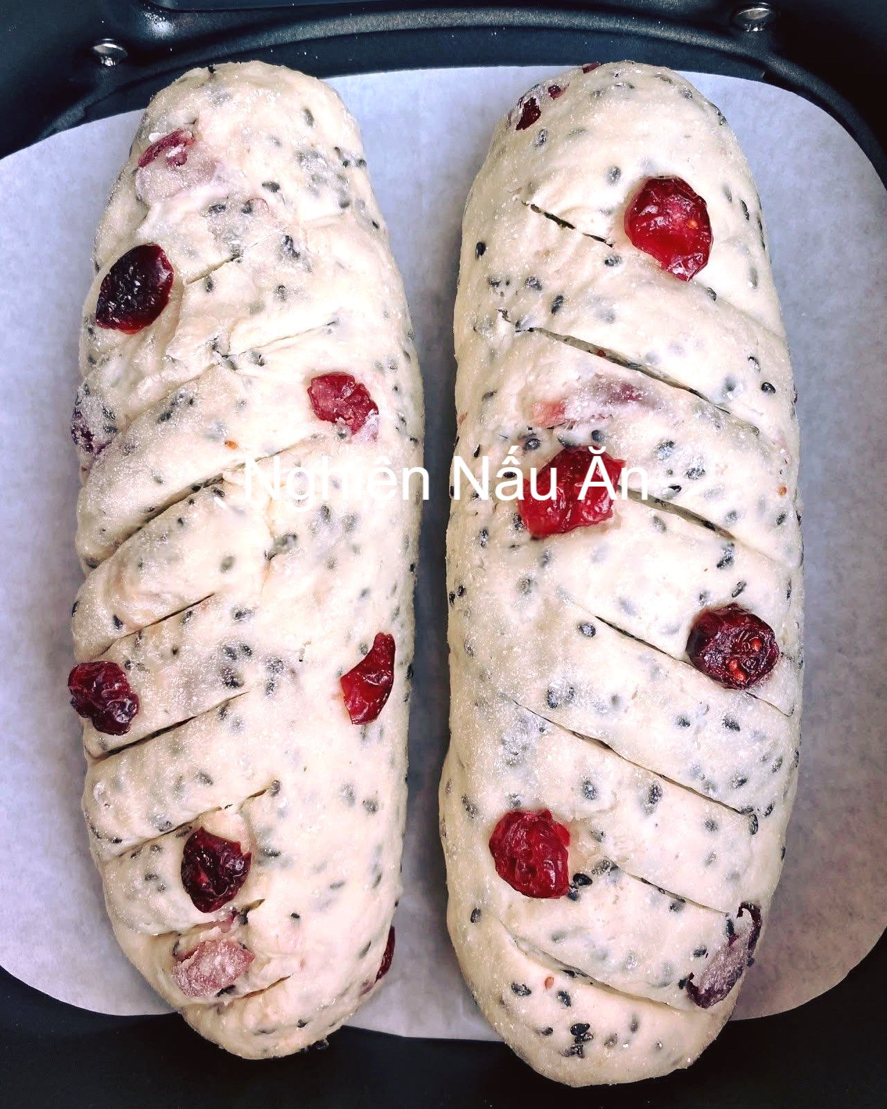 ĐÂY LÀ CÁCH LÀM BÁNH MÌ MÈ ĐEN VỚI NAM VIỆT QUẤT BẰNG NỒI CHIÊN KHÔNG DẦU CỰC KỲ NGON VÀ DỄ LÀM. Nguyên liệu: - 250g bột mì đa dụng - 3g men nở - 2g muối - 20g mè đen - 40g nam việt quất khô - 180ml sữa tươi ko đường Cách làm: - Cho 3g men nở với 180ml sữa tươi vào tô rồi khuấy đều, để yên 5-10 phút cho nổi bọt. - Cho 250g bột mì, 2g muối, 20g mè đen và 40g nam việt quất vào tô. Đổ hỗn hợp men sữa vào, trộn đều cho bột quyện lại, nhồi đến khi bột mịn dẻo. - Dùng màng bọc thực phẩm đậy lại, ủ bột trong 1h hoặc đến khi nở gấp đôi. - Ch.ia bột thành 2 phần, vo tròn hoặc tạo hình dài như bánh mì. - Cho bột vào nồi chiên không dầu, có lót giấy nến. Để bột nghỉ thêm khoảng 20-30 phút cho nở thêm. - Xịt 1 ít nước lên bề mặt bánh, cho bánh vào nướng ở 150 độ C trong 15 phút, lật mặt rồi nướng thêm 15 phút nữa. - Lấy bánh ra, rây ít bột mì lên trên. C.ắt thành những lát mỏng là xong! Chúc cả nhà thành công với cách làm trên.