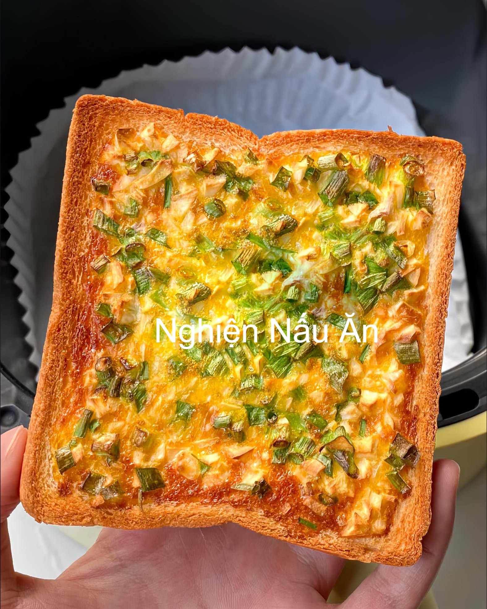 HƯỚNG DẪN CÁCH LÀM BÁNH MÌ NƯỚNG TRỨNG TỎI THƠM NGON ĐƠN GIẢN . Chuẩn bị nguyên liệu : - Bánh mì sandwich - 1 quả trứng gà - 1 thìa tỏi băm - 1 thìa hành lá - Phô mai bào - Gia vị : muối , hạt nêm Cách Làm : 1 . Khuấy tan trứng - tỏi và hành . 2 . Rải phô mai bào lên bề mặt bánh mì . 3 . Cho hỗn hợp trứng hành lên , xếp vào nồi chiên không dầu ở 180° trong 7 phút rồi lấy ra thưởng thức . Chúc cả nhà thành công với công thức này nhé.