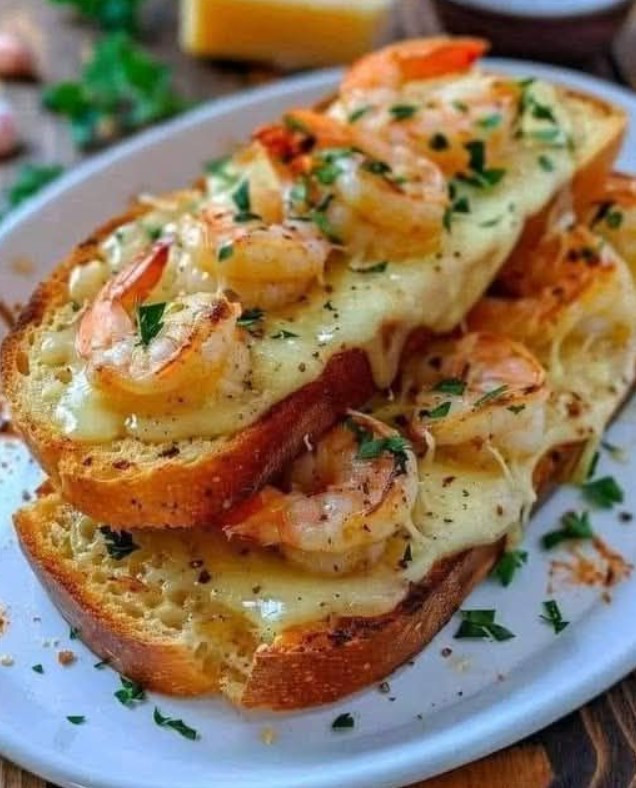Bánh mì tỏi phô mai tôm nướng phô mai 🧀😍😋 Thành phần: Dành cho Bánh mì Tỏi: 1 ổ bánh mì Pháp, cắt lát dài một nửa 4 muỗng bơ, làm mềm 3 củ tỏi, băm nhỏ 1/4 ly phô mai Parmesan bào sợi 1 muỗng canh cần tây băm Dành cho nhân tôm: 1 tạ tôm, bóc nõn và nõn 2 muỗng canh dầu ô liu Muối tiêu để nếm 1 muỗng cà phê paprika Dành cho Sandwich: 1 cốc phô mai Monterey Jack bào sợi Thêm bơ để nướng Hướng dẫn: Chuẩn bị bánh mì tỏi: Làm nóng trước lò nướng của bạn đến 375°F (190°C). Trong một cái bát nhỏ, trộn với nhau bơ làm mềm, tỏi băm, phô mai Parmesan và cần tây. Rải đều hỗn hợp bơ tỏi trên mỗi nửa bánh mì Pháp. Đặt trên một tấm giấy nướng và nướng trong 10-12 phút, hoặc cho đến khi cạnh vàng và giòn. Nấu tôm: Làm nóng dầu ô liu trong một cái chảo với nhiệt trung bình. Nêm món tôm với muối, tiêu, và paprika. Nấu tôm cho 2-3 phút.