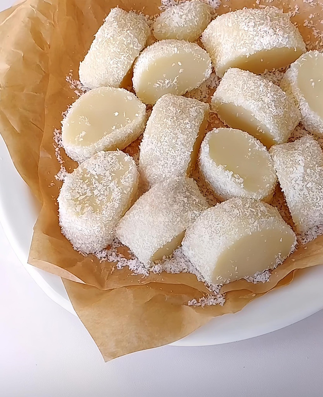 LƯU NGAY CÁCH LÀM BÁNH NẾP DỪA DẺO NGỌT THƠM NGON . Chuẩn bị nguyên liệu : - 110g bột nếp - 180ml sữa dừa - 30g đường - 30g bột bắp - 15g bơ lạt - Vụn cơm dừa sấy Cách Làm : 1 . Cho bột nếp , bột bắp , đường và sữa dừa vào bát . Khuấy đều đến khi không còn vón cục rồi lọc lại một lần . 2 . Dùng màng thực phẩm bọc lại , cho vào nồi hấp trong 25 phút . 3 . Sau đó lấy ra , thêm bơ lạt rồi nhào thành khối dẻo mịn . 4 . Cuối cùng nhào thành dải dài , rắc vụn cơm dừa lên rồi cắt miếng vừa ăn . Chúc cả nhà thành công với công thức này nhé.