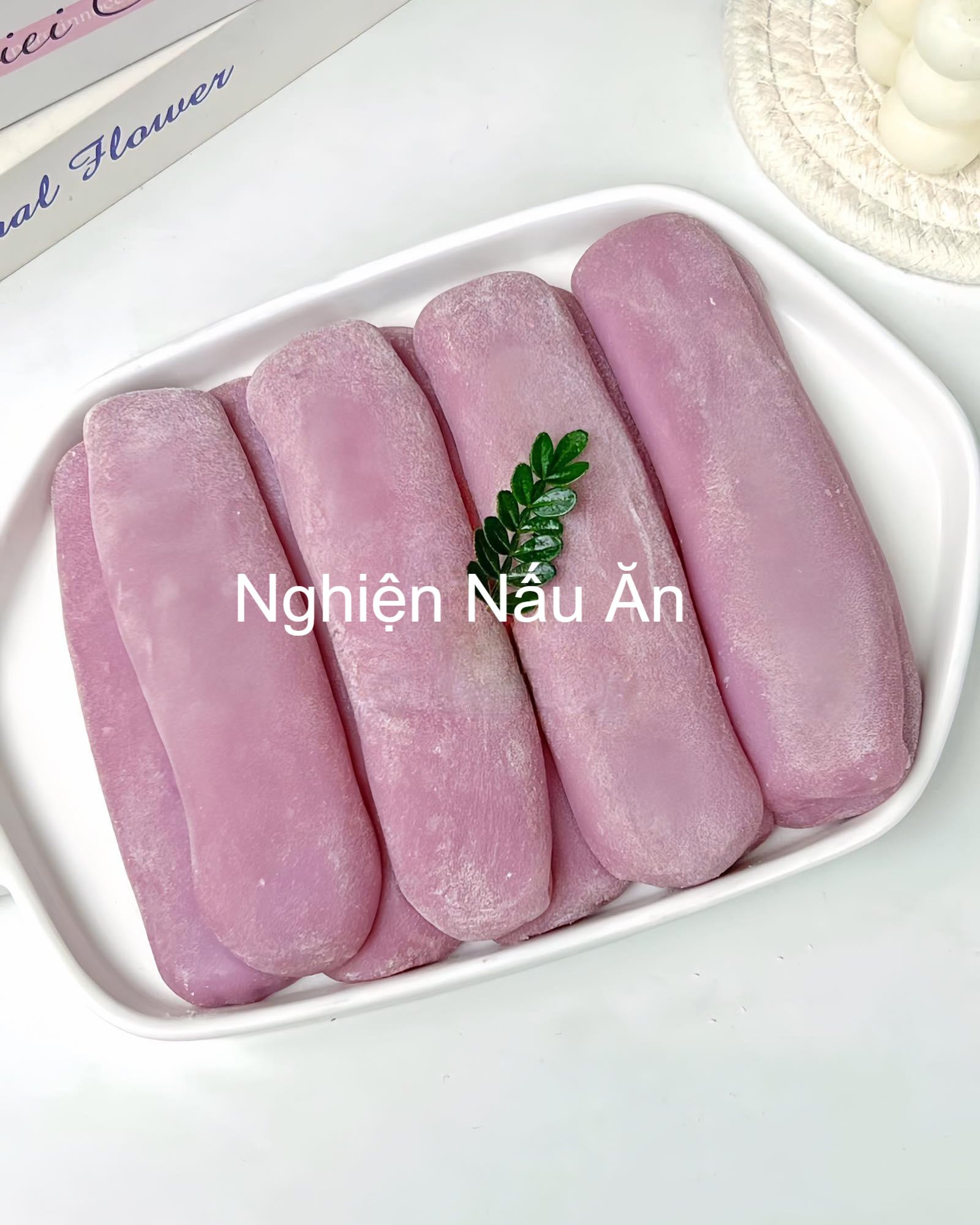 CÁCH LÀM BÁNH NẾP KHOAI MÔN DẺO NGỌT THƠM NGON . Chuẩn bị nguyên liệu : - 50g bột nếp - 15g bột bắp - 6g bột khoai tím - 10g đường - 140ml sữa tươi - 10g bơ lạt - 1 thìa sữa đặc - 100g khoai môn Cách Làm : 1 . Cho bột nếp , bột bắp , 10g đường , 90ml sữa tươi và 3g bột khoai tím vào bát . Khuấy đều rồi lọc lại 1 lần . 2 . Dùng màng thực phẩm bọc lại ( lấy tăm chọc vài lỗ lên bề mặt ) . 3 . Đun sôi nước , cho vào nồi hấp chín . Sau đó lấy ra , thêm bơ lạt rồi nhào thành khối bột dẻo mịn . 4 . Khoai môn gọt vỏ , cắt khúc , cho vào nồi hấp chín . 5 . Thêm sữa đặc , 3g bột khoai tím và 50ml sữa tươi rồi cho vào máy xay nhuyễn . Cho hỗn hợp vừa xay vào túi bắt kem . 6 . Chia bánh nếp thành các phần nhỏ , cáng mỏng rồi cho kem vào , cuộn lại là xong . Chúc cả nhà thành công với công thức này nhé.
