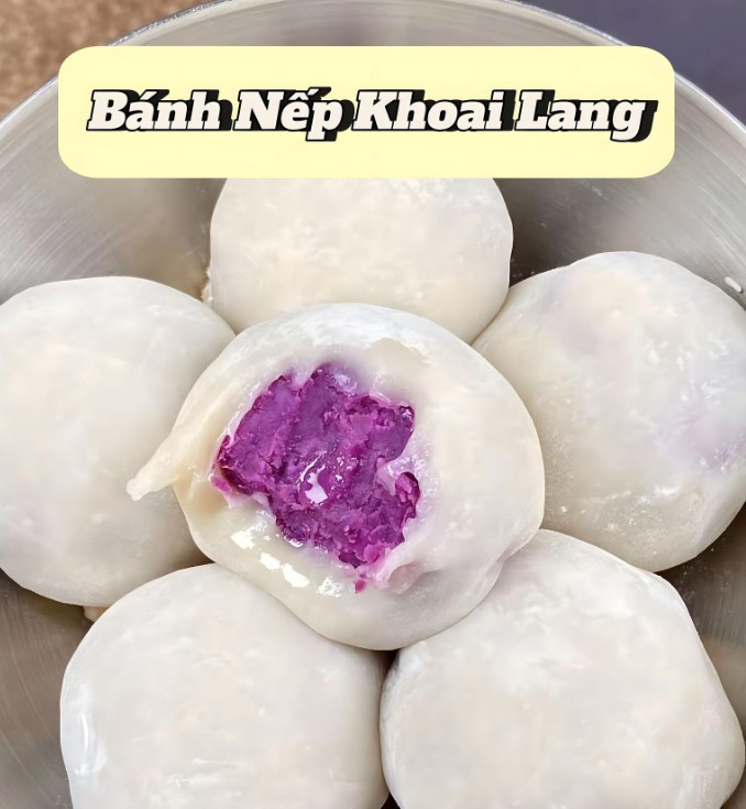 Bánh Nếp Khoai Lang Chuẩn bị nguyên liệu : - 110g bột nếp - 70g đường - 30g tinh bột bắp - 230ml sữa tươi ( không đường ) - 10g bơ lạt - 100g khoai lang tím - 1 thìa sữa đặc - 20g bột nếp chín Cách Chế biến : 1 . Khoai lang tím hấp chín , thêm 20g đường , 1 thìa sữa đặc và 50ml sữa tươi cho vào máy xay nhuyễn . 2 . Cho bột nếp , tinh bột bắp , 180ml sữa tươi và 50g đường vào bát . Trộn đều , cho vào nồi hấp trong 25 phút . 3 . Sau đó lấy ra , thêm 10g bơ rồi nhào thành khối bột dẻo mịn . 4 . Chia bột thành từng phần nhỏ , cáng mỏng , cho nhân khoai lang tím vào rồi vo tròn . Phủ qua 1 lớp bột nếp chín và thưởng thức .