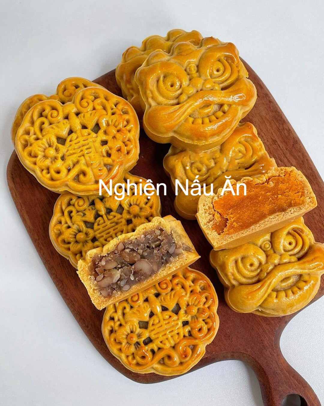 CÁCH LÀM BÁNH NƯỚNG NHÂN NGŨ VỊ VÀ NHÂN TRỨNG MUỐI ĐƠN GIẢN, DỄ LÀM. Nguyên liệu Vỏ bánh: - Nước đường bánh nướng (siro đường): 220g - Dầu đậu phộng : 60g - Nước lọc: 8g - Bột mì đa dụng: 320g Quét mặt bánh: - 1 lòng đỏ trứng gà - 5ml sữa tươi ko đường Nhân trứng muối: - Đậu xanh cà vỏ: 200g - Đường: 100g - Dầu ăn: 40g - Bột nếp rang: 20g - 8 lòng đỏ trứng muối Nhân ngũ vị: - Hạt óc chó: 30g - Hạnh nhân: 30g - Hạt bí: 30g - Hạt dưa: 30g - Mứt bí, nho khô: 40g - Vừng trắng rang: 20g - Mỡ đường: 20g - Bột nếp rang: 10g - R.ượu mai quế lộ: 5g - Nước đường bánh nướng: 40g Cách làm Làm vỏ bánh: - Trộn nước đường bánh nướng, dầu đậu phộng và nước trong tô rồi khuấy đều. - Thêm bột mì, trộn đến khi thành khối bột dẻo mịn. Bọc kín, để bột nghỉ 2h cho mềm và dễ nặn. Làm nhân trứng muối: - Ngâm đậu xanh 2-3h, hấp chín, x.ay nh.uyễn. - Cho đậu xanh vào chảo. Thêm đường và dầu ăn, sên l.ửa nhỏ đến khi đặc mịn, ráo. - Cho bột nếp rang vào, đảo đều. Lấy ra để nguội, chia thành viên nhỏ - Mỗi viên nhân bọc 1 lòng đỏ trứng muối ở giữa (nhân ~45g). Làm nhân ngũ vị: - Rang thơm các loại hạt, c.ắt nhỏ. Trộn cùng mứt, nho khô và mè rang. - Cho mỡ đường, r.ượu mai quế lộ, nước đường và bột nếp rang vào trộn đều. Ch.ia nhân thành các viên nhỏ (~45g) Đóng bánh: - Ch.ia bột thành viên 30g. C.án mỏng bột, cho nhân trứng muối/ nhân ngũ vị vào giữa, gói kín. - Lăn qua 1 lớp bột mỏng để chống dính. Cho vào khuôn, ấn chặt để tạo hình. Nướng bánh: - Làm nóng lò ở nhiệt độ 180 độ C, phun nhẹ nước lên bề mặt bánh để tránh nứt. - Cho bánh vào nướng lần 1 trong 10 phút. Lấy ra, để nguội 5 phút. - Quét hỗn hợp lòng đỏ trứng và sữa tươi. Cho bánh vào nướng lần 2 trong 7-10 phút đến khi vàng đều. - Cho bánh vào nướng lần 3 (nếu cần), nướng trong 5 phút để màu đẹp hơn! - Bánh nướng xong để 1-2 ngày cho vỏ xuống dầu, mềm và bóng đẹp rồi mới thưởng thức! Chúc cả nhà thành công với cách làm trên.