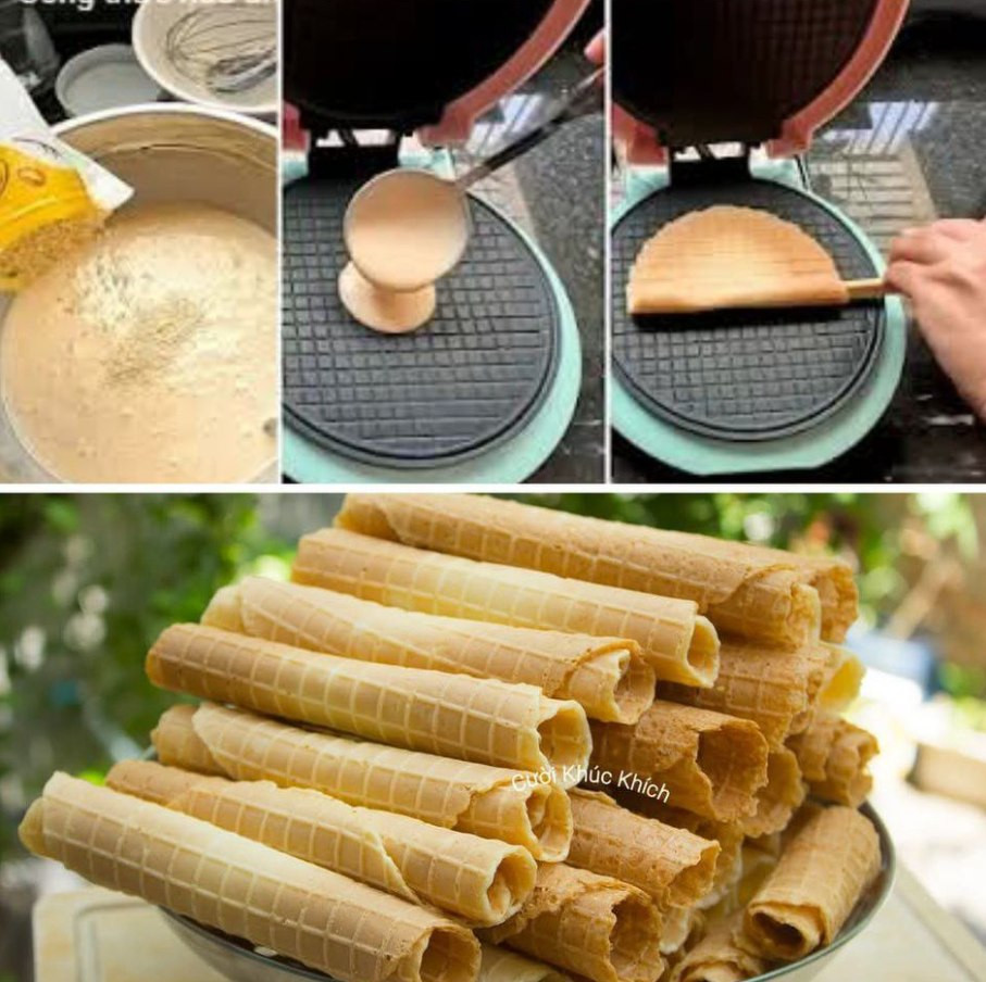 Công thức bánh ống (bánh kẹp cuốn) tự pha bột giòn lâu CÔNG THỨC - 170g bột gạo - 80g bột năng - 200ml nước cốt dừa - 140g đường - 10g dầu dừa - 20g mè - 3 quả trứng gà - xíu muối và ít vani