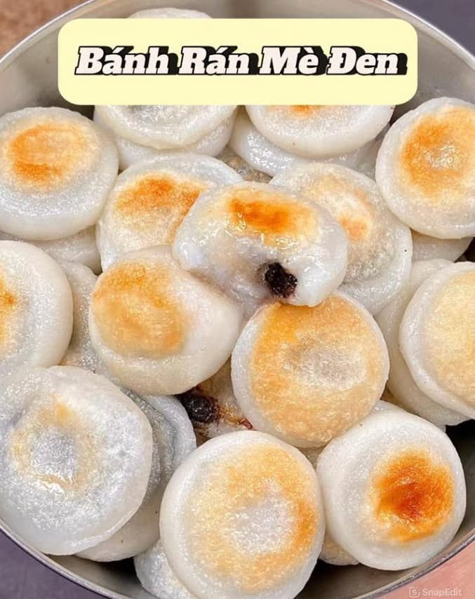 ánh Rán Mè Đen Chuẩn bị nguyên liệu : - 150g bột nếp - 130ml nước sôi - 30g mè đen ( đã rang ) - 20g đường nâu - 10g vụn cơm dừa -20g đậu phộng giã nhuyễn Cách Chế biến : 1 . Trộn đều mè rang , đường nâu , đậu phộng và cơm dừa . 2 . Cho bột nếp vào bát , thêm nước sôi rồi trộn đều , nhào thành khối bột . 3 . Chia bột thành từng phần nhỏ , cáng mỏng , cho nhân mè đen đã trộn vào rồi vo tòn , ấn dẹt . 4 . Quét 1 lớp dầu lên chảo , cho bánh vào chiên đến khi vàng đều 2 mặt . - Thêm 1 ít nước , đậy nắp nấu ở l.ửa nhỏ đến khi chín