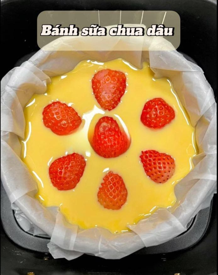 Bánh sữa chua dâu Chuẩn bị nguyên liệu : - 200ml sữa chua - 2 quả trứng gà - 30g bột bắp - 20g đường - 7 quả dâu tây Cách Chế biến : 1 . Dâu tây bỏ cuống , ngâm qua nước muối pha loãng rồi xả lại bằng nước , để ráo . 2 . Cho vào bát 2 quả trứng , 200ml sữa chua , 30g bột bắp và 20g đường khuấy đến khi bột không còn vón cục . 3 . Đổ vào khuôn có lót giấy nến rồi xếp dâu lên , cho vào nồi chiên không dầu ở 150° trong 25 phút .