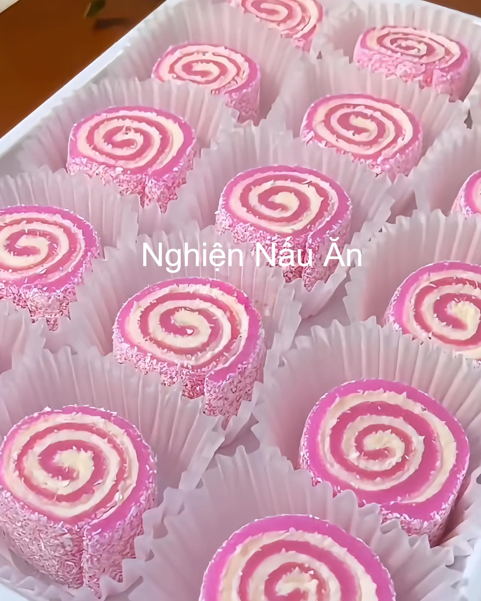 LƯU NGAY CÁCH LÀM BÁNH THANH LONG CUỘN KEM TƯƠI LẠ MÀ NGON . Chuẩn bị nguyên liệu : - 250ml sữa tươi - 30g đường - 15g dầu ăn - 230g bột nếp - 150ml whipping cream - 10g đường - 1 thìa nước ép thanh long đỏ ( thìa ăn cơm ) - Cơm dừa sấy Cách Làm : 1 . Cho sữa tươi , đường , dầu ăn và bột nếp vào bát . Khuấy đều đến khi không còn vón cục . 2 . Dùng màng thực phẩm bọc lại ( lấy tăm chọc vài lỗ trên bề mặt ) , đun sôi nước , cho vào nồi hấp cách thuỷ trong 25 phút . 3 . Sau khi bột chín thì lấy ra , thêm nước ép thanh long rồi nhào thành khối dẻo mịn . 4 . Đ.ánh bông whipping cream và đường rồi cho vào túi bắt kem . 5 . Cáng mỏng phần bột rồi rắc vụn cơm dừa đều 2 mặt , cho hỗn hợp kem tươi lên , dàn đều rồi cuộn lại , cắt miếng vừa ăn . Chúc cả nhà thành công với công thức này nhé.