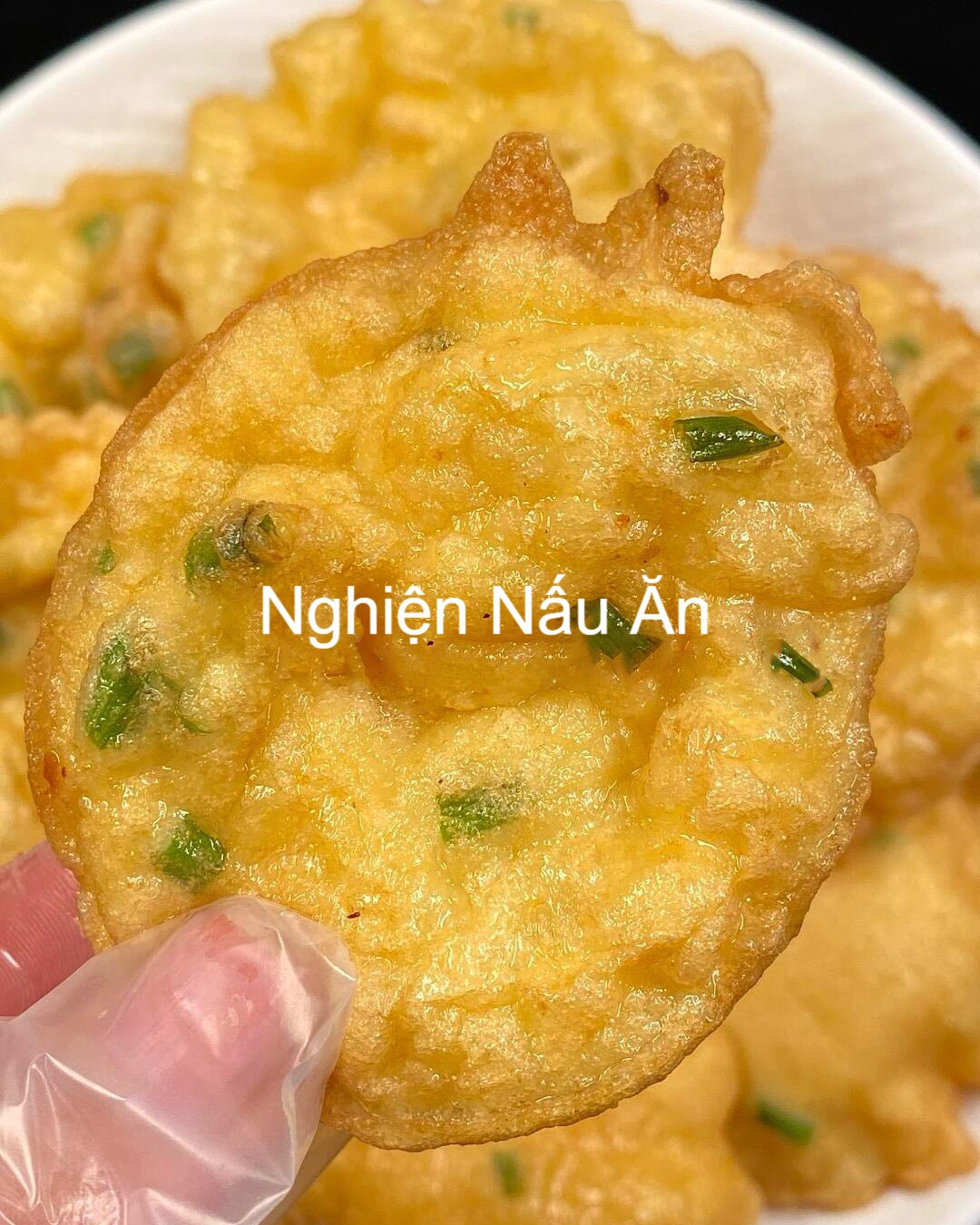 HƯƯỚNG DẪN CẢ NHÀ CÁCH LÀM BÁNH TRỨNG CHIÊN GIÒN SIU NGON. Nguyên liệu: - 6 quả trứng gà - 300g bột mì - 1/2 thìa muối - 100ml b.ia - 100ml nước lọc Cách làm: - Pha trứng gà cùng b.ia và nước lọc rồi khuấy đều. - Cho thêm bột mì, muối và hành lá x.ắt nhỏ vào. Trộn đều, khuấy cho hỗn hợp đặc quánh lại. - Dùng màng bọc thức phẩm bọc lại khoảng 10 phút cho bột nghỉ. - Đun s.ôi dầu. Dùng muôi nhúng vào chảo dầu, xúc từng thìa trứng cho vào chiên. - Khi cho trứng vào, nhớ nhúng ngập thìa trong dầu, trứng đông lại sẽ tự động trượt khỏi thìa. Khi chiên, nhớ khuấy nhẹ để cho trứng chín đều, chiên đến khi bánh trứng vàng óng thì vớt ra, để ráo dầu là xong! Chúc cả nhà thành công với cách làm trên.