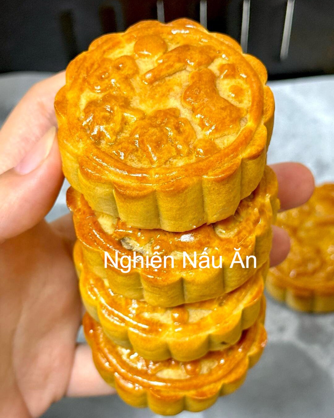 TỰ LÀM BÁNH NƯỚNG NHÂN ĐẬU ĐỎ CHO DỊP TRUNG THU CỰC NGON BẰNG NỒI CHIÊN KHÔNG DẦU. Nguyên liệu: - Siro đường: 55g - Nước lọc: 2g - Dầu ngô: 30g - Bột mì đa dụng: 100g - 1 quả trứng gà - Nhân đậu đỏ sên sẵn - Nước đường bánh nướng Cách làm: - Trộn đều 55g siro đường với 2g nước và 30g dầu ngô. Rây 100g bột mì vào, khuấy đều rồi nhào thành khối mịn. - Dùng màng bọc thực phẩm bọc lại, để bột nghỉ 1h cho dẻo và dễ cán. - Lấy bột ra, ch.ia thành các phần nhỏ (~ 20g vỏ:30g nhân). Cán mỏng từng phần bột, cho nhân đậu đỏ vào giữa rồi gói kín. Cho viên bánh vào khuôn, ấn chặt để tạo hình. - Cho bánh vào nồi chiên không dầu, có lót giấy nến. Lần 1: Phết nhẹ lớp nước đường, nướng ở nhiệt độ 170 độ C trong 5 phút cho bánh se mặt. Lần 2: Phết thêm nước trứng đ.ánh tan, nướng tiếp ở nhiệt độ 150 độ C trong 8 phút. Lần 3: Lật bánh, tiếp tục nướng thêm 5-7 phút để bánh vàng đều. - Lấy bánh ra, để nguội trên rack cho thoáng khí. Bánh mới nướng thường hơi cứng, nên để 1–2 ngày trong hộp kín sẽ mềm ngon hơn! Chúc cả nhà thành công với cách làm trên.