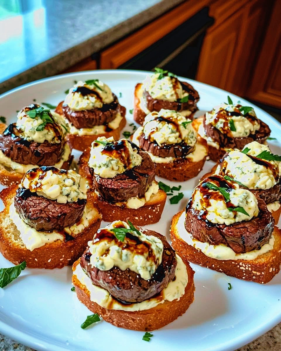 Spoon a dollop of warm Gorgonzola sauce over each toasted crostini. Place a beef medallion on top, then add a small spoonful of additional cheese sauce.