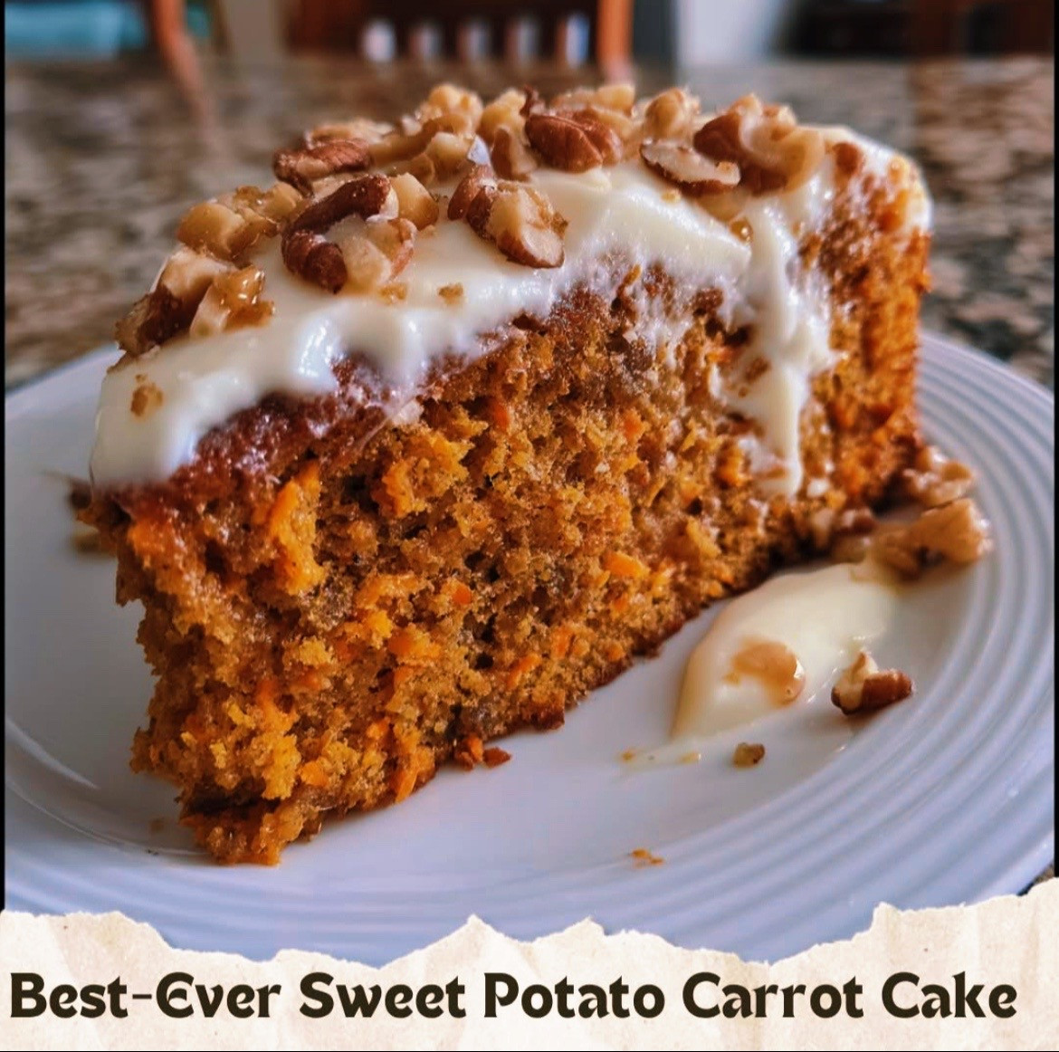 Instructions: 1. Preheat your oven to 350°F (175°C) and grease a 9x13 inch baking pan. 2. In a large bowl, combine the mashed sweet potatoes, grated carrots, granulated sugar, brown sugar, vegetable oil, eggs, and vanilla extract. Mix until well combined. 3. In another bowl, whisk together the flour, baking powder, baking soda, cinnamon, nutmeg, and salt. 4. Gradually add the dry ingredients to the wet mixture, stirring until just combined. If using, fold in the chopped nuts. 5. Pour the batter into the prepared baking pan and spread it evenly. 6. Bake for 30-35 minutes, or until a toothpick inserted in the center comes out clean. 7. Allow the cake to cool in the pan for about 10 minutes, then transfer it to a wire rack to cool completely. 8. Once cooled, spread your favorite cream cheese frosting on top and enjoy a slice of nostalgia! #cake #cakerecipe #carrotcake #sweetpotatocake #dessert
