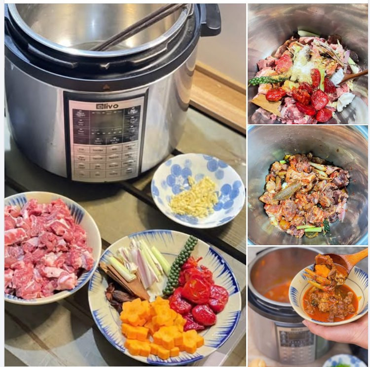 Bí quyết nấu BÒ SỐT VANG đơn giản mà ngon: ✔️ Nguyên liệu: - 300g gân bò, 400g dẻ sườn bò - 100g gấc chín bỏ hạt (hoặc cà chua) - 3 củ sả đập dập, cắt khúc - 1 thìa gừng và 1 thìa tỏi xay nhuyễn - Hoa hồi, quế, thảo quả, tiêu xanh - 3 thìa mắm, 1 thìa bột canh, 1 thìa đường, 2 thìa dầu ăn - Cà rốt, hành lá, rau mùi - 1 bát rượu trắng ✔️ Cách làm: - Thịt bò thái miếng, rửa và bóp sạch với rượu trắng. - Trộn đều thịt bò và các loại gia vị, rồi ướp 20 phút. - Bật nồi áp suất ở chế độ "Thủ công", đảo lên cho ngấm đều gia vị. - Thêm nước lọc cho ngập thịt, chọn chức năng "Thịt" và điều chỉnh thời gian nấu trong 40 phút. - Nồi nấu xong, cho cà rốt vào nấu thêm 5 phút nữa. - Thêm hành, rau mùi là lên mâm ạ