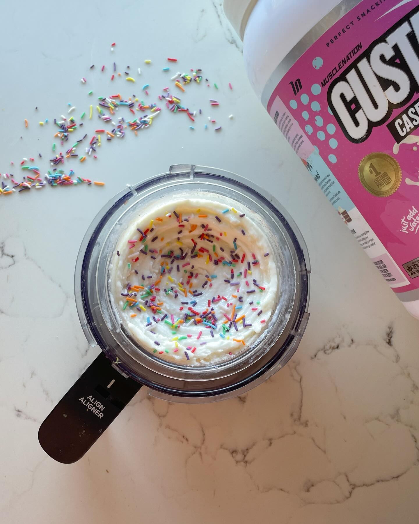 - 150g vanilla yoghurt - 2 scoop birthday cake custard casein @musclenation (dc NOURISHLILY) - sprinkles - water/milk to fill line