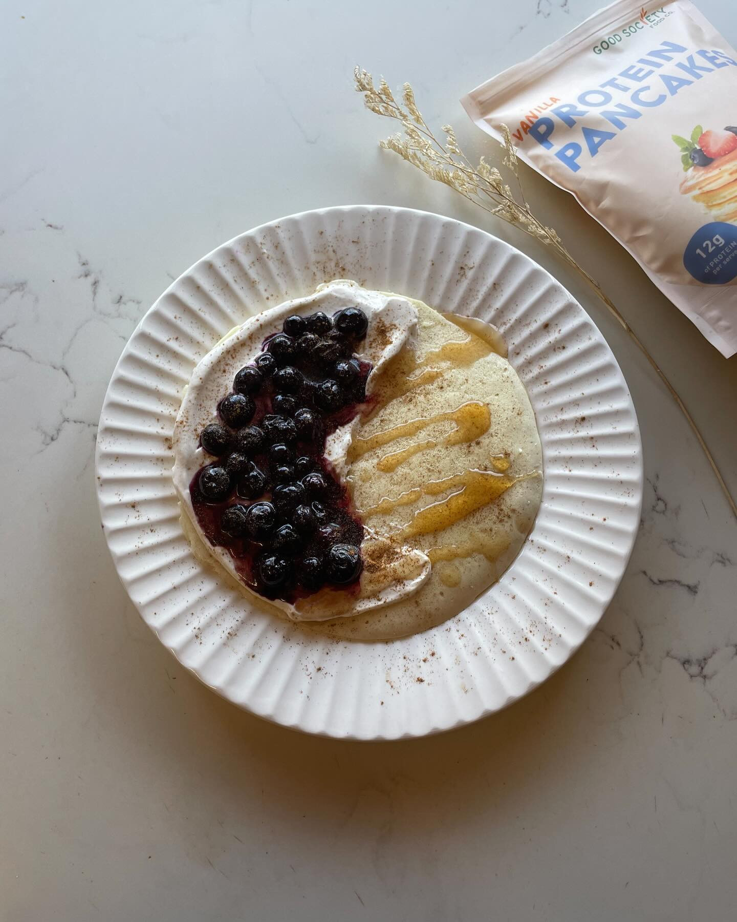- 60g protein pancake mix @goodsocietyfood (dc NOURISH10) + enough water to make desired consistency - 1/2tsp cinnamon - caramel yoghurt @yoproau - melted blueberries - maple syrup 🥞🤍