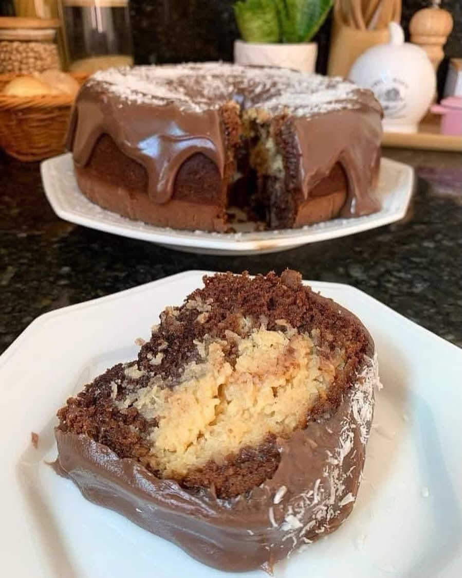 Com uma forma untada acrescente a massa, posteriormente coloque o recheio de coco(o recheio precisa estar frio e consistente). Leve ao forno pré-aquecido a 180 graus por uns 40 (ou até fazer o teste do palito e ele sair limpinho). Quando desenformar (com o bolo totalmente frio) acrescente a calda e decore com coco ralado. E está prontinho