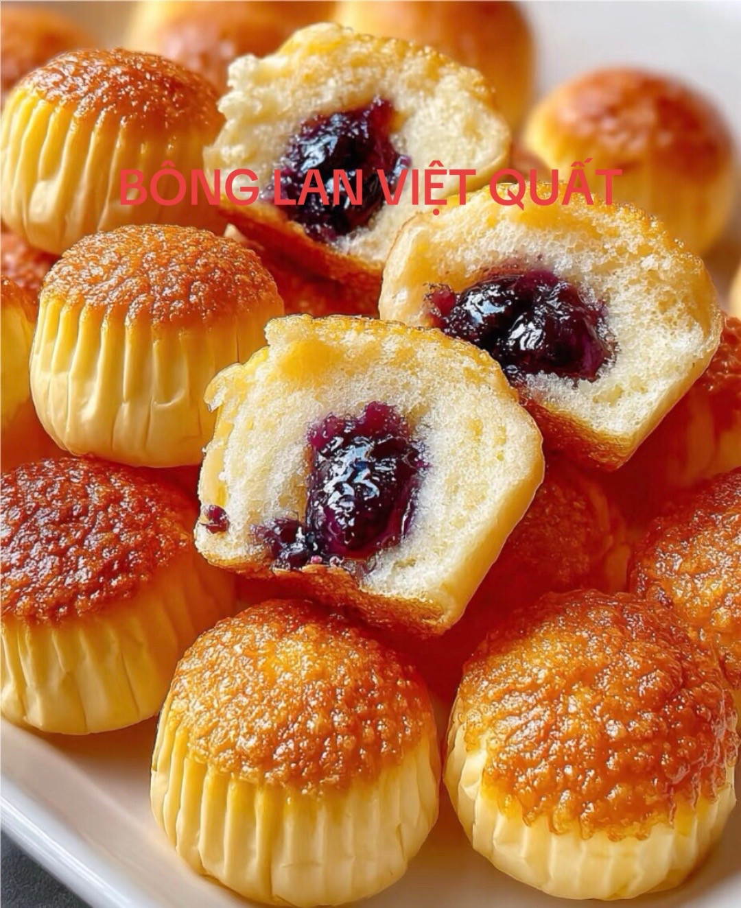 3️⃣ Đặt giấy nến vào khuôn, đổ bột vào túi bắt kem, bóp một nửa bột vào, đặt quả việt quất lên trên, sau đó bóp phần bột còn lại vào.