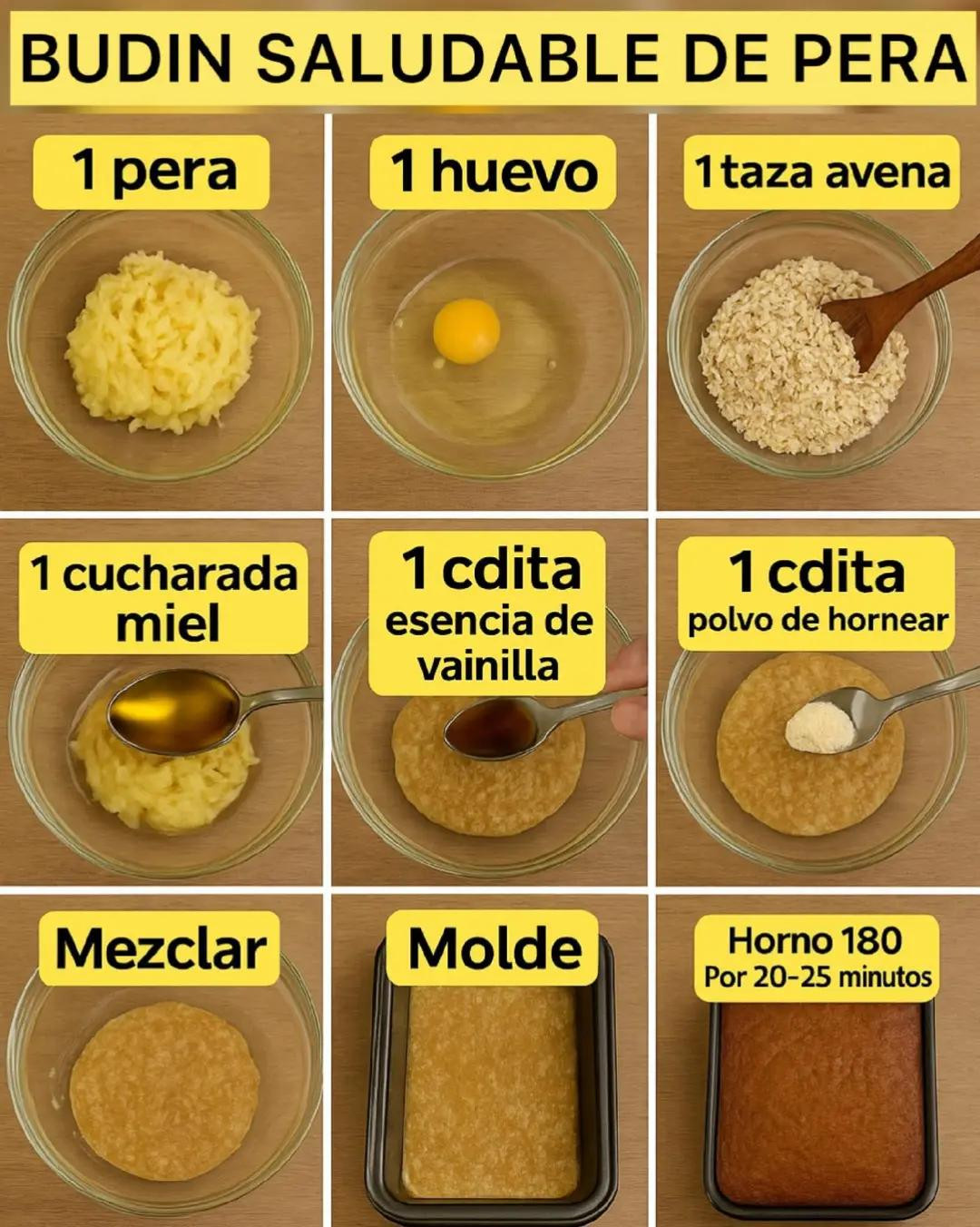 BUDIN SALUDABLE DE PERA, Sin harina – sin azúcar refinada – súper húmeda y aromática Ingredientes 1 pera rallada finita (bien madura) 1 huevo 1 taza de avena (instantánea o tradicional) 1 cucharada de miel o 2 cdas de azúcar mascabo 1 cucharadita de esencia de vainilla 1 cucharadita de polvo para hornear 1 pizca de canela (opcional pero combina increíble) Preparación Rallá la pera lo más finito posible. Si está bien madura, mucho mejor. Sumá el huevo y mezclá. Agregá la avena y mezclá hasta integrar. Incorporá la miel, la esencia de vainilla y la canela si la usás. Añadí el polvo para hornear y mezclá bien. Colocá la preparación en un molde pequeño o moldecitos individuales. Horneá a 180°C por 20–25 minutos, hasta que esté doradito y firme. Dejá entibiar y listo: ¡una tortita húmeda y perfumada! Resultado Una tortita esponjosa, bien aromática y naturalmente dulce gracias a la pera. Perfecta para desayunos saludables, meriendas o para acompañar el mate. #fblifestyle #recetasaludable #cocinacasera