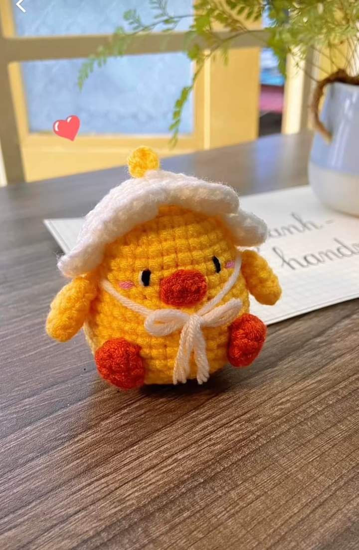 Búp bê gà dễ thương với mũ len trắng và nơ thắt cổ