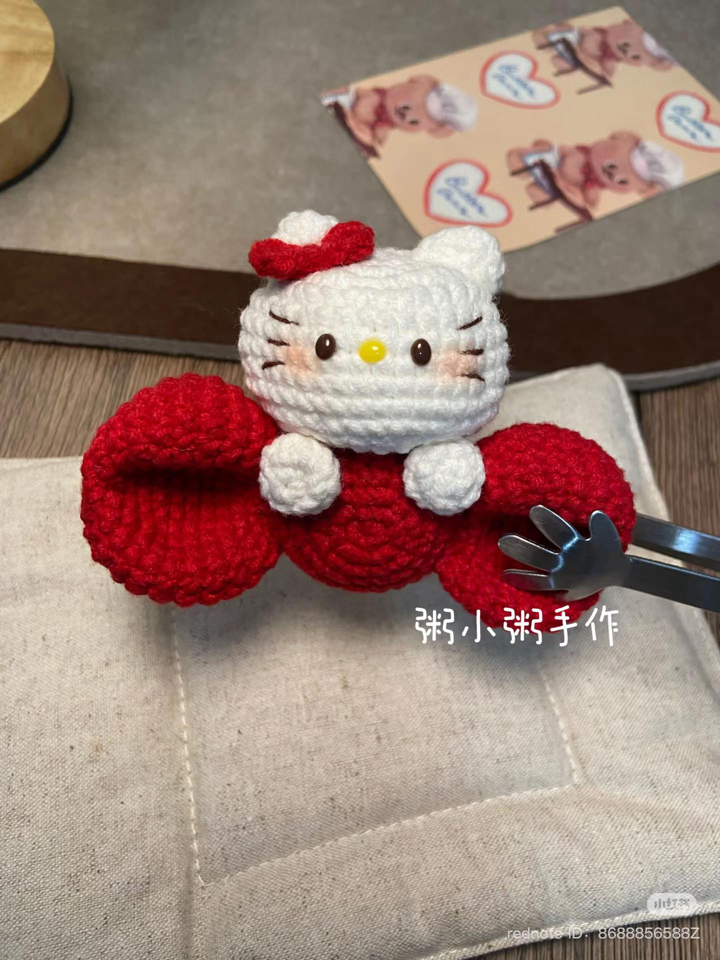 Búp bê mèo đan len đáng yêu với nơ đỏ dễ thương