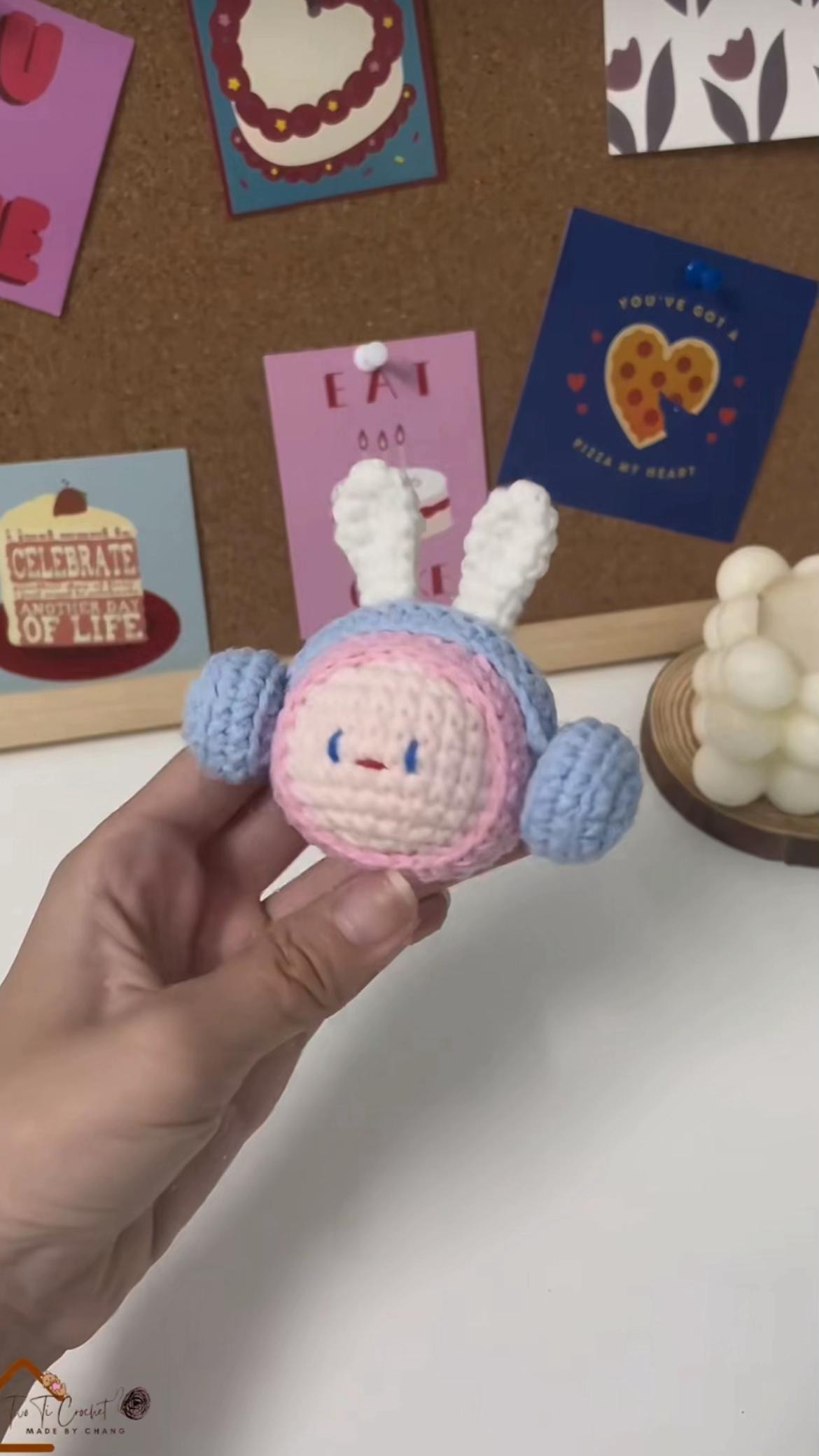Búp bê móc len hình tròn với tai thỏ dễ thương và tay màu xanh