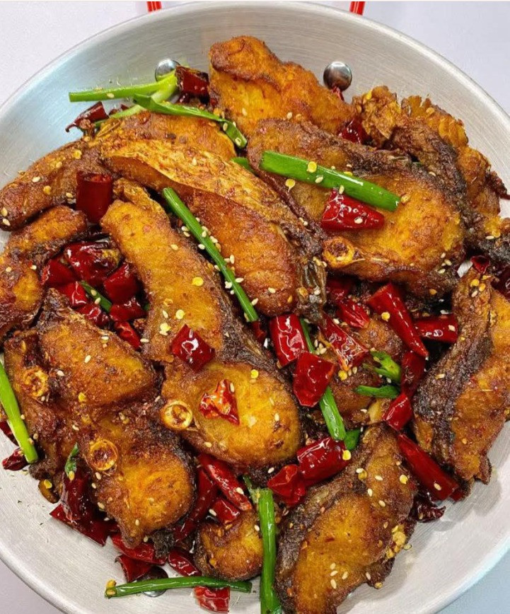 CÁ CHIÊN THƠM CAY Nguyên liệu (3-4 người ăn) - 500g cá (cắt lát dày) – có thể dùng cá rô phi hoặc cá trắm - 1 nhánh gừng cắt sợi - 2-3 cây hành lá cắt khúc - 4 tép tỏi bóc vỏ - 30-40g ớt khô cắt khúc - 1-2 thìa canh hạt hoa tiêu - Dầu ăn để chiên và xào Gia vị ướp và nêm: - 1 thìa canh rượu nấu ăn - 1 thìa canh nước tương nhạt (dùng khi ướp) - 1/2 thìa cà phê tiêu bột - 1 thìa canh bột năng - 2 thìa canh nước tương (dùng khi xào) - Muối vừa đủ Cách làm 1. Cá rửa sạch, để ráo rồi cắt miếng dày vừa ăn. Cho một ít gừng và hành vào từng miếng cá để thấm. 2. Cho cá vào tô, thêm rượu nấu ăn, nước tương, tiêu bột và bột năng. Trộn đều, ướp khoảng 20 phút. 3. Đun chảo dầu sâu, khi dầu nóng thì cho cá vào chiên. Chiên đến khi định hình thì lật, tiếp tục chiên đến khi vàng giòn. Vớt ra để ráo dầu. 4. Chừa lại một ít dầu trong chảo. Cho gừng, hành, tỏi, hoa tiêu và ớt khô vào phi thơm. 5. Cho cá đã chiên vào đảo nhanh, rưới nước tương, nêm muối vừa ăn, đảo đều cho cá thấm gia vị. 6. Tắt bếp, có thể rắc thêm hành lá. Ăn nóng là ngon nhất. Mẹo: Muốn cá giòn lâu thì chiên hai lần – chiên sơ, để ráo rồi chiên lại nhanh khi chuẩn bị ăn. Cre: sưu tầm