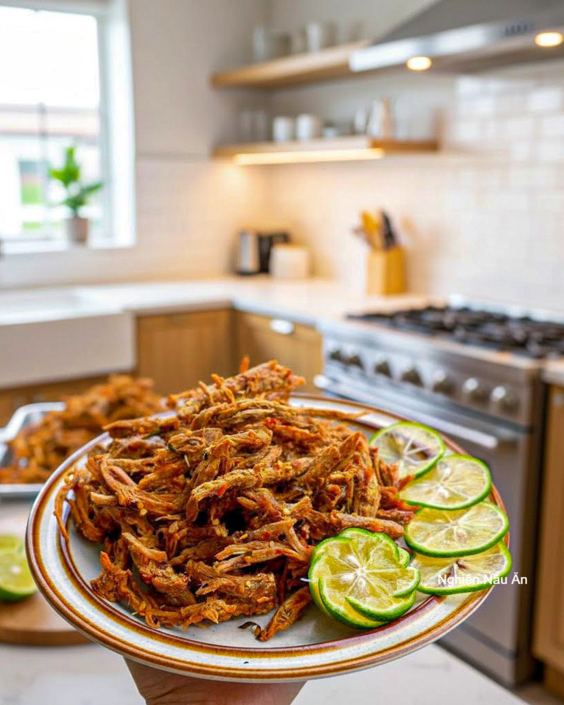 CÁCH LÀM KHÔ NẠC HEO ( Khô Heo ) BẰNG NỒI CHIÊN CỤC KỲ ĐƠN GIẢN NHÂM NHI NGÀY TẾT NGON ĐÚNG VỊ. Nguyên liệu - 1,5kg thịt nạc mông (cắt thớ dài, dày ~1,5cm) - 4 muỗng canh dầu hào - 4 muỗng canh tương ớt - 1 muỗng cà phê muối - 3 muỗng cà phê hạt nêm - 1 muỗng cà phê ngũ vị hương - ½ chén đường - Sả, hành, tỏi băm (sả và ớt nhiều cho thơm ngon) - Dầu màu điều Cách làm chi tiết Hấp thịt - Rửa sạch thịt, hấp với sả và hành tây cho chín. - Giữ lại 1 chén nước hấp để làm sốt. Nấu sốt - Phi thơm sả với dầu màu điều, tiếp tục phi hành tỏi. - Trộn nước hấp với dầu hào, tương ớt, muối, hạt nêm, ngũ vị hương, đường. - Nấu đến khi hỗn hợp sệt lại. Xé thịt & trộn sốt - Thịt hấp chín đập mềm, xé sợi vừa ăn. - Trộn sốt đã nấu với thịt xé, đảo trên bếp cho thấm gia vị và cạn hết sốt. Sấy khô bằng nồi chiên - Xếp thịt lên khay, chọn chế độ Sấy ở 100°C khoảng 1 giờ, đảo khay cho đều. - Tiếp tục sấy ở 100°C tổng cộng 8–10 tiếng đến khi thịt khô vừa ý. Thành phẩm - Thịt khô dai ngọt, thơm nức mùi sả ớt, vị đậm đà. - Màu sắc đẹp mắt, ăn chơi hoặc làm quà biếu Tết đều sang. - Bảo quản trong hộp kín, để tủ mát. Có thể bỏ thêm gói hút ẩm để giữ lâu hơn. Chúc cả nhà có mẻ khô nạc heo thơm ngon chuẩn vị Tết!