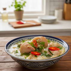 CÁCH NẤU CANH MĂNG GIÒ HEO NƯỚC TRONG VẮT, NGỌT THANH, ĂN LÀ GHIỀN. Nguyên liệu chuẩn bị - 1kg giò heo (chọn phần nhiều thịt, săn chắc) - 500g măng tươi - 2 củ hành tím nguyên củ - 2 tép tỏi, 2–3 củ hành tím băm - Hành lá, ớt sừng - Gia vị: muối hạt, muối thường, hạt nêm, đường phèn, nước mắm, bột ngọt Các bước thực hiện Sơ chế giò heo - Cạo sạch lông, chà kỹ phần móng. - Bóp muối hạt, rửa sạch, để ráo. - Trụng sơ giò heo với nước sôi + muối khoảng 3 phút, vớt ra rửa lại. Hầm giò heo lấy nước dùng trong - Cho giò heo vào nồi cùng 2 lít nước. - Thêm hành tím nguyên củ. - Nêm ½ muỗng muối + 10g đường phèn. - Đun sôi mạnh, hớt bọt liên tục. - Hạ lửa nhỏ, hầm khoảng 1 giờ 15 phút, không đậy nắp để nước trong. Xào măng cho thơm - Cắt măng thành miếng dài vừa ăn. - Phi thơm hành tỏi, cho măng vào xào. - Nêm ½ muỗng hạt nêm, đảo nhanh tay cho măng mềm và thơm. Hầm giò heo cùng măng - Sau khi hầm giò xong, vớt bỏ hành tím, châm thêm nước nếu cần. - Cho măng đã xào vào nồi. - Nêm: 10g muối + 1 muỗng hạt nêm + 2 muỗng nước mắm + 10g bột ngọt. - Hầm thêm 15 phút cho măng thấm vị, giò mềm hoàn hảo. Hoàn thiện - Dùng que xiên kiểm tra giò: mềm nhưng không nát. - Rắc hành lá, thêm vài lát ớt sừng. - Múc ra tô, dùng nóng. Thành phẩm - Nước dùng trong vắt ngọt thanh tự nhiên từ xương và măng. - Giò heo mềm tan nhưng săn chắc, không bở. - Măng giòn, thơm, thấm vị béo nhẹ. - Ăn kèm cơm trắng hoặc chấm nước mắm ớt cay cay → đúng chuẩn “đỉnh của chóp”, cực kỳ đưa cơm và ấm bụng. Mẹo nhỏ: Nếu thích vị cay nồng hơn, có thể thêm vài lát gừng khi hầm giò để nước dùng dậy mùi và ấm bụng hơn. Chúc cả nhà thành công với cách làm trên, đừng quên chia sẻ công thức để lan toả công thức đến những người yêu thương nhé cả nhà.