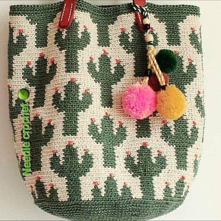 Cactus Pattern Crochet Bag with Colorful Pom Poms