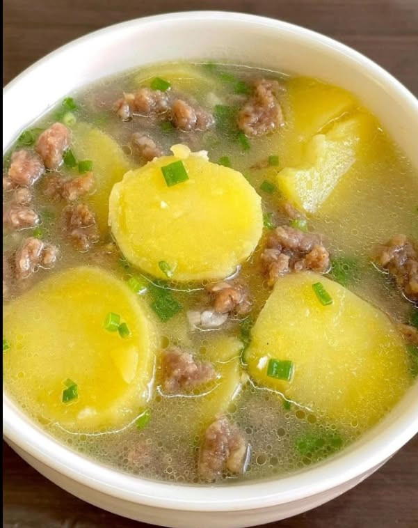 Canh thịt bò khoai tây * Chuẩn bị nguyên liệu: - Thịt bò, khoai tây - Gia vị: muối, hạt tiêu xay * Cách chế biến: 1. Xào thịt bò và khoai tây: cho tỏi băm vào đảo qua cho thơm rồi mình đổ thịt bò băm vào đảo cùng, đảo đến khi thịt chín thì mình sẽ cho khoai tây vào, đảo đều tay khoảng 2 phút thôi 2. Cho một bát nước lọc vào nồi rồi đậy vung lại đun khoảng 10 phút cho khoai tây mềm rồi nêm thêm ít hạt nêm và muối theo khẩu vị của gia đình, rắc thêm chút hạt tiêu và hành lá lên nữa là xong