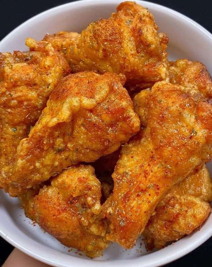 CÁNH GÀ CHIÊN GIÒN NGUYÊN LIỆU • Cánh gà • Bột muối tiêu tỏi • Hạt tiêu xay • Trứng gà: 1 quả • Bột ớt (tùy chọn) • Bột mì: 2 thìa • Nước mắm: 2 thìa • Muối CÁCH LÀM CHI TIẾT 1. Khía nhẹ lên phần thịt dày của cánh gà để thấm gia vị và chiên nhanh chín hơn. Ướp cánh gà với 1/2 thìa bột muối tiêu tỏi, 2 thìa nước mắm, một chút hạt tiêu và muối. Để thấm gia vị trong 30 phút. 2. Sau khi ướp, thêm 1 quả trứng gà và 2 thìa bột mì vào cánh gà, trộn đều. 3. Làm nóng dầu, cho cánh gà vào chiên đến khi vàng đều hai mặt. Nếu thích ăn cay, rắc thêm bột ớt sau khi chiên.