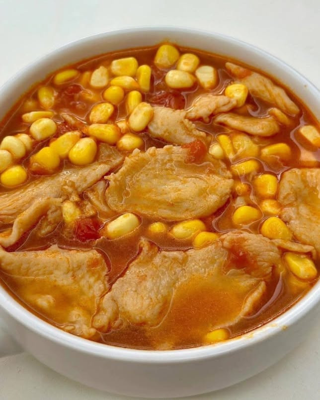* Chuẩn bị nguyên liệu - Cà chua, ức gà, ngô - Gia vị: mắm, dầu hào, tương cà * Cách chế biến 1. Ức gà thái miếng mỏng ướp cùng 1 thìa baking soda khoảng 10 phút rồi rửa sạch lại 2. Ướp ức gà với 1 thìa mắm, 1 thìa rượu nấu ăn, 1 thìa bột bắp, trộn đều lên rồi ướp 5 phút 3. Dầu nóng, cho hành vào phi thơm rồi cho cà chua vào xào mềm. Sau đó đổ thêm 1 bát nước vào để nấu canh 4. Cho thêm ngô vào đun khoảng 1 phút thì cho ức gà vào nấu. Khi thấy ức gà đổi màu thì nêm thêm 1 thìa nước mắm, 1 thìa dầu hào, 1 thìa tương cà, khuấy đều lên rồi đun thêm một lúc nữa cho ức gà chín là xongong Ẩn bớt