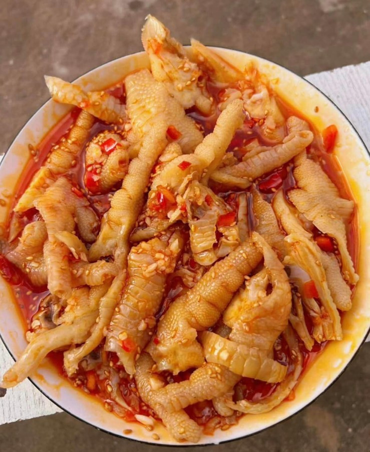 Chân gà sốt thái Chuẩn bị nguyên liệu : - Chân gà rút xương 1 kg - Xoài xanh 1 trái - Tắc 10 trái - Sả 4 nhánh - Ớt sừng 1 trái - Gừng 1 củ - Nước mắm 140 ml - Đường 140 gr - Nước cốt me 30 gr - Tương ớt Hàn Quốc 30 gr - Ớt bột Hàn Quốc 30 gr Cách Chế biến : 1 . Bắc một nồi lên bếp, bạn thêm vào 140ml nước mắm, 140gr đường, 30gr nước cốt me, 30gr tương ớt Hàn Quốc, 30gr ớt bột Hàn Quốc và 100ml nước. - Tiếp theo bạn bật bếp lên rồi khuấy đều gia vị cho tan hoàn toàn sau đó bạn tiếp tục để lửa cho đến khi sốt sệt lại thì tắt bếp. 2 . Bạn cho chân gà vào một thau lớn, thêm vào 1 muỗng canh muối hạt và 2 muỗng canh giấm ăn rồi dùng tay bóp đều chân gà để loại bỏ chất bẩn. - Sau đó bạn đổ nước chanh giấm đi rồi rửa chân gà lại với nước từ 2 - 3 lần cho chân gà thật sạch . 3 . Bạn rửa sạch 2 nhánh sả rồi cắt làm 3 khúc, tiếp theo rửa sạch rồi thái lát 1 củ gừng. - Bắc một nồi nước lên bếp đun đến khi nước sôi lăn tăn thì cho chân gà thêm phần sả cắt khúc và gừng thái lát vào luộc trong 15 phút. - Sau đó vớt ra rổ rửa lại với nước lạnh, bạn chuẩn bị luôn 1 thau đá lớn thêm vào một ít nước lạnh rồi ngâm chân gà ít nhất 15 phút. 4 . Xoài xanh mua về bạn gọt vỏ rồi tách làm đôi để bỏ phần hạt non bên trong sau đó cắt xoài thành những khối nhỏ vừa ăn khoảng 1.5 lóng tay. - Tắc mua về bạn rửa sạch vỏ, sau đó thái lát mỏng . - 2 nhánh sả còn lại bạn cũng đem đi rửa sạch rồi thái lát mỏng theo chiều xéo. - Ớt sừng cắt đuôi rồi vò nhẹ quanh thân để loại bỏ hạt ớt thái lát mỏng . 5 . Bạn cho chân gà ra tô thêm phần nước sốt vào trộn đều lên, tiếp theo bạn cho lần lượt từng nguyên liệu xoài, tắc, sả vào trộn đều trước khi thêm vào nguyên liệu mới, khi trộn đều các nguyên liệu thì bạn ướp hỗn hợp chân gà trong 15 phút. - Cuối cùng, bạn cho phần ớt đã thái mỏng vào trộn đều là hoàn thành rồi nhé . Nguồn sưu tầm