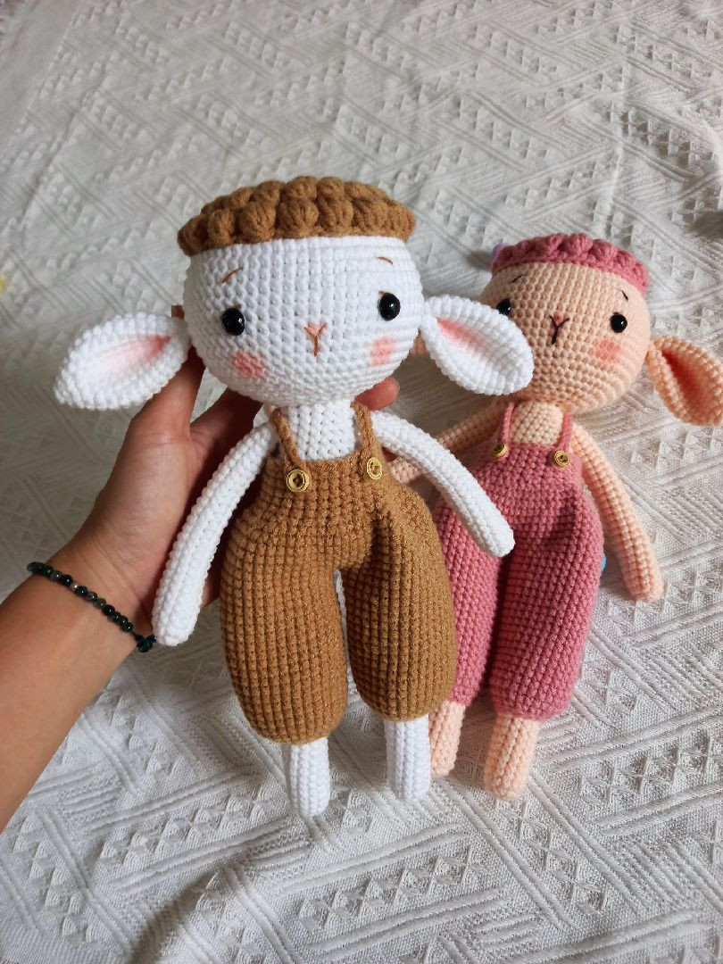 Chart móc len cừu dễ thương với quần yếm màu nâu và hồng