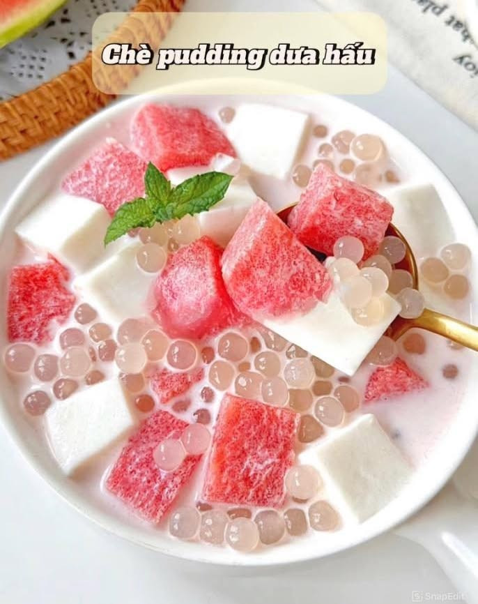 Chè pudding dưa hấu - Dưa hấu - Bột báng - Nước cốt dừa - Bột rau câu - Đường Cách Chế biến : 1 . Đun sôi nước cho bột báng vào luộc khoảng 15 phút rồi tắt bếp , đậy nắp để trong khoảng 10 phút . - Vớt ra xả qua nước lạnh vài lần rồi để ráo . 2 . Cho 600ml nước cốt dừa , 100g đường và 6g bột rau câu vào nồi nấu đến khi sôi thì tắt bếp , cho ra khuôn đợi nguội & đông lại thì cắt miếng nhỏ . 3 . Cho thạch dừa , dừa hấu và bột báng vào bát , rưới nước cốt dừa lên , thêm đá viên & thưởng thức
