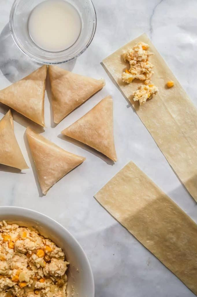 Note : Make sure you freeze the samosas before frying, else the cheese will ooze out before the samosas are crisp. This can be frozen for later use. Makes about 12 cheese samosa..