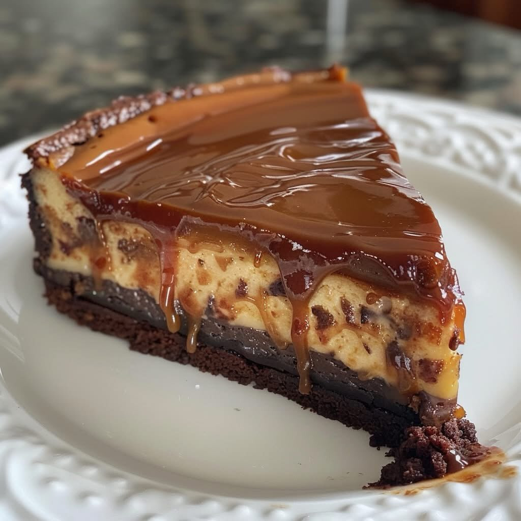 ✨ Resultado Final • Base escura e úmida de brownie • Cheesecake claro com pedacinhos de chocolate visíveis • Camada grossa de caramelo brilhante, escorrendo exatamente como na foto 🍰