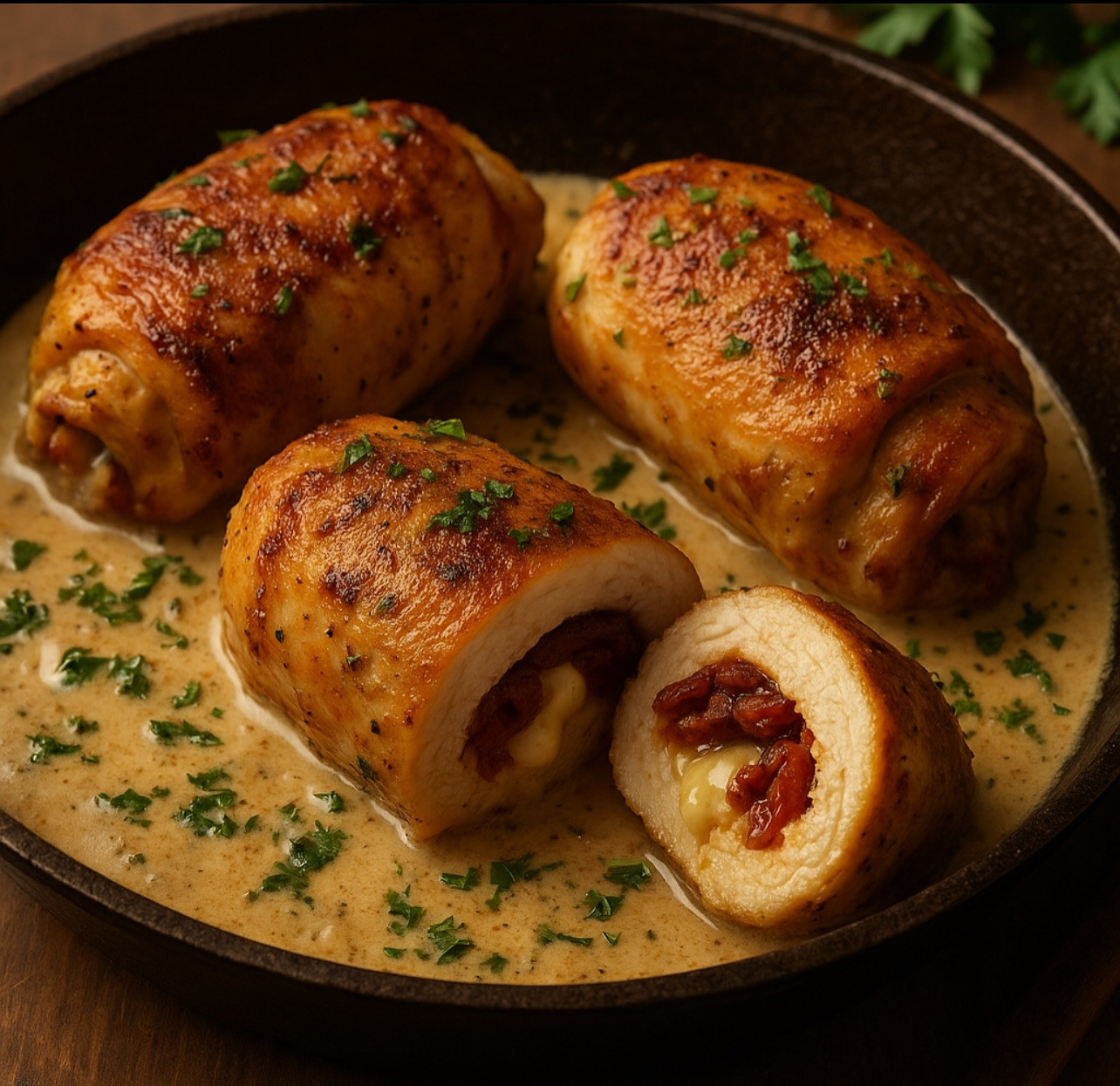 Cheesy Sun-Dried Tomato Chicken Rolls in Creamy Herb Sauce