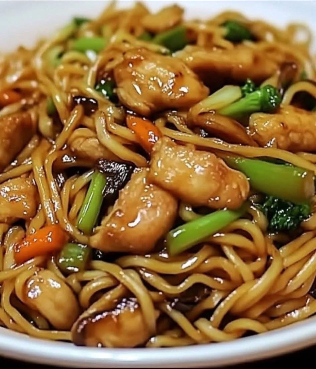 Cook lo mein noodles according to package instructions, drain, and set aside. Heat 1 tbsp oil in a large skillet or wok over medium-high heat. Cook chicken until browned and fully cooked, then remove and set aside. Add remaining oil to the skillet, sauté garlic for 1 minute, and add vegetables. Stir-fry until tender-crisp. In a bowl, mix soy sauce, oyster sauce, hoisin sauce, and sesame oil. Add cooked chicken, noodles, and sauce to the skillet. Toss everything together and stir-fry for 2-3 minutes. Season with salt and pepper, garnish with green onions, and serve. #chickenlomein #lomeinnoodles #chineesefood #noodles #easyrecipe
