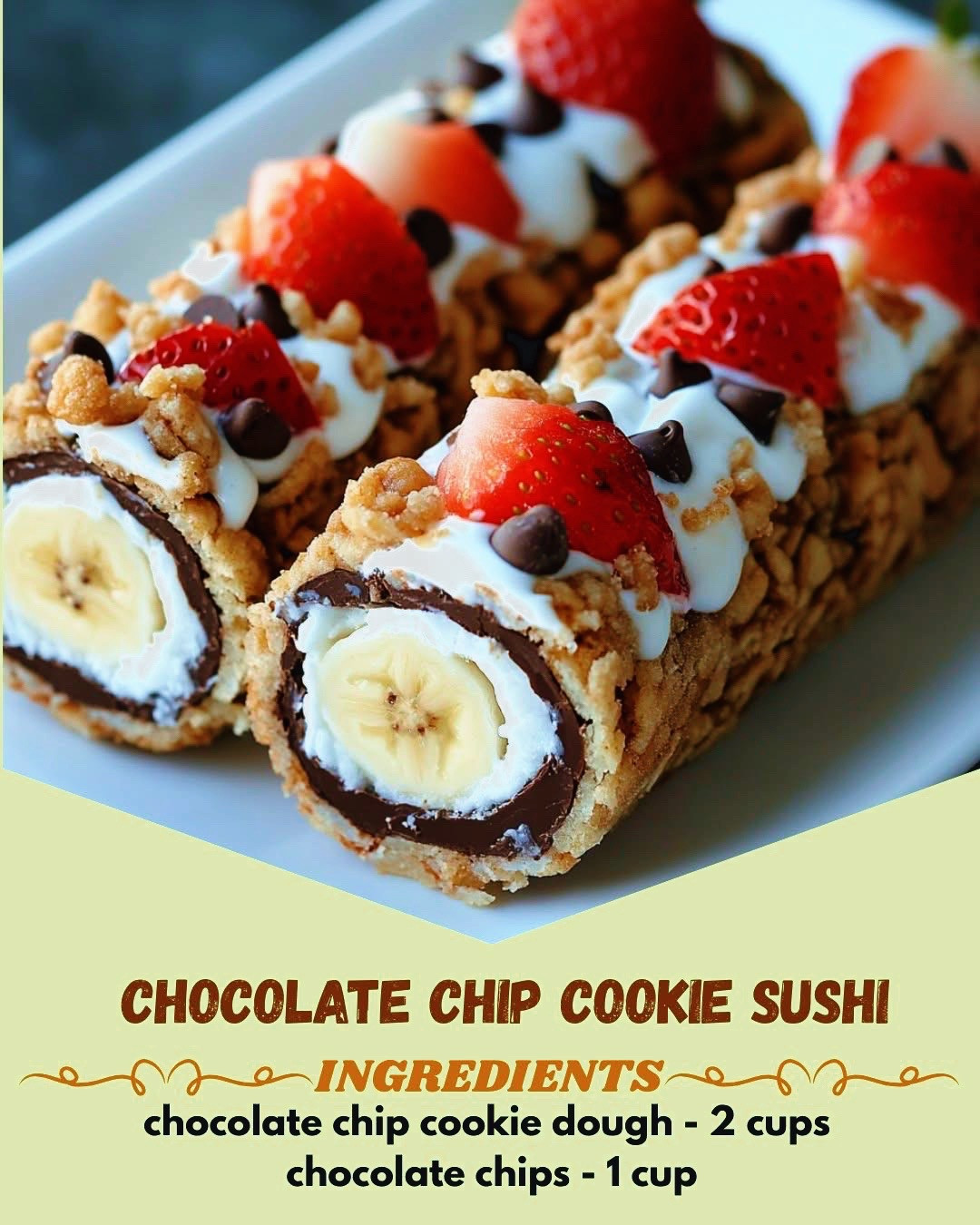 8. Serve: Arrange the chocolate chip cookie sushi on a platter and enjoy as a fun and creative dessert!