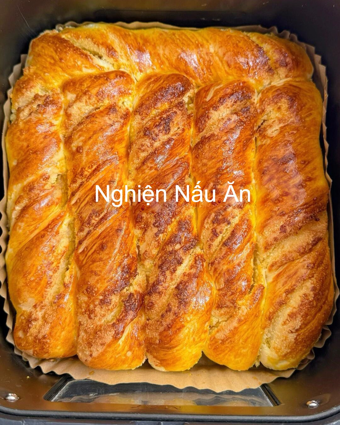 CÁCH LÀM BÁNH MÌ CUỘN NHÂN DỪA BẰNG NỒI CHIÊN KHÔNG DẦU CỰC KỲ NGON. Nguyên liệu: Phần bột bánh: - 300g bột mì số 11 - 4g men nở - 40g đường - 2g muối - 30g bơ mềm - 1 quả trứng gà - 100ml sữa tươi ko đường * Phần nhân dừa: - 60g dừa nạo mịn - 30g đường bột - 30ml dầu ngô - 1 quả trứng gà Cách làm: Phần bột bánh - Cho 300g bột mì, 40g đường, 4g men nở, 1 quả trứng gà và 100ml sữa tươi vào tô. Trộn đều rồi nhào đến khi quyện lại. - Thêm 30g bơ mềm và 2g muối, nhào tiếp đến khi bột mịn, kéo được màng mỏng. - Ủ bột trong tô có bọc kín, để nơi ấm áp cho bột nở gấp 1,5 lần. Phần nhân dừa: Cho 60g dừa nạo, 30g đường bột, 1 quả trứng gà và 30ml dầu ngô vào tô, trộn đều thành hỗn hợp ẩm, dẻo. - Lấy bột ra, ấn xẹp bọt khí, cán dẹt bột thành hình chữ nhật. - Phết nhân dừa đều mặt bột, gấp đôi lại, ấn nhẹ cho phẳng. C.ắt thành 6 dải dài. - Lót giấy nến trong nồi chiên không dầu, cho bột vào xếp 1 dải ngang và 5 dải dọc. Xoắn các thanh bột ngược chiều nhau để tạo hoa văn. - Đặt khay bột trong nồi chiên (ko bật máy), ủ thêm đến khi nở gấp 1,5 lần. - Quét mặt bánh bằng lớp trứng mỏng cho vàng bóng. - Nướng bánh ở nhiệt độ 145 độ C trong 20 phút, lật lại và nướng thêm 5-7 phút cho chín vàng đều là hoàn thành! Chúc cả nhà thành công với cách làm trên.